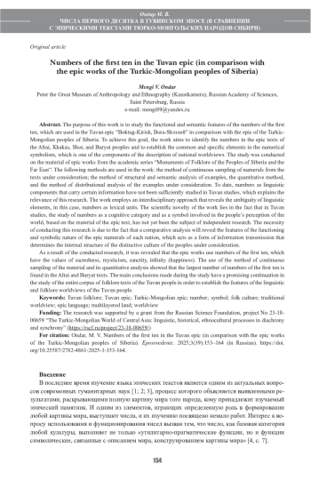 Целью представленной работы является изучение функционально-семантической особенности чисел первого десятка, которые употребляются в тувинском эпосе «Боктуг-Кириш, БораШээлей» в сравнении с эпосом тюрко-монгольских народов Сибири. Для достижения указанной цели в работе решается задача выявления чисел в эпических текстах алтайского, хакасского, шорского и бурятского народов и установления общих и специфических элементов в числовой символике, являющейся одним из компонентов описания национальных картин мира. Исследование было проведено на материале эпических произведений из академической серии «Памятники фольклора народов Сибири и Дальнего Востока». В работе используются следующие методы: метод сплошной выборки числительных из рассматриваемых текстов, метод структурно-семантического анализа примеров, квантитативный метод, а также метод дистрибутивного анализа рассматриваемых примеров. На сегодняшний день в тувиноведении недостаточно изучены числа как языковые компоненты, несущие в себе определённую информацию, благодаря которой объясняются символы окружающей нас действительности, в связи с чем объясняется актуальность настоящего исследования. В работе применяется междисциплинарный подход, раскрывающий многозначность языковых элементов, в данном случае – числа, как лексической единицы. Научная новизна работы заключается в том, что в тувиноведении изучение чисел как когнитивной категории и как символов, участвующих в мировосприятии народа, на материале эпического текста еще не было предметом самостоятельного исследования. Сравнительный анализ позволил выявить особенности функционирования и символической природы эпических числительных каждого народа, которые выступают формой трансляции информации, определяющей внутреннюю структуру самобытной культуры рассматриваемых народов.