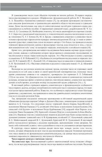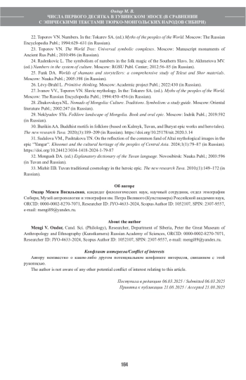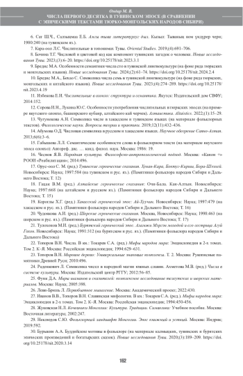 10. Бредис М.А., Бохао С. Символика числа семь в тувинской лингвокультуре (на фоне ряда тюркских, монгольских и китайского языков). Новые исследования Тувы. 2023;(4):274-289. DOI: 10.25178/nit.2023.4.19