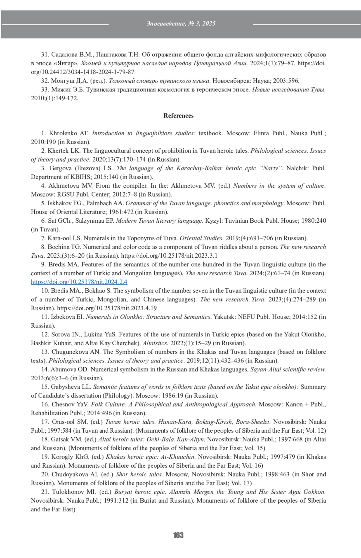 33. Мижит Э.Б. Тувинская традиционная космология в героическом эпосе. Новые исследования Тувы. 2010;(1):149 ̶172.