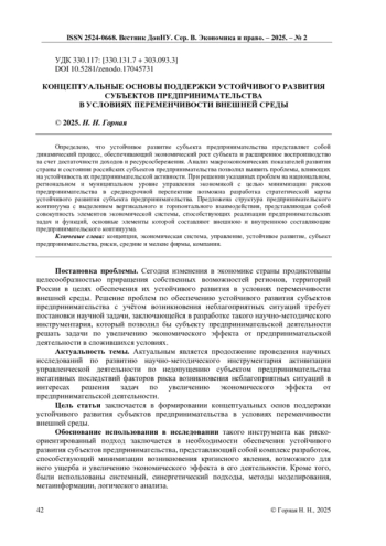 Определено, что устойчивое развитие субъекта предпринимательства представляет собой динамический процесс, обеспечивающий экономический рост субъекта и расширенное воспроизводство за счет достаточности доходов и ресурсосбережения. Анализ макроэкономических показателей развития страны и состояния российских субъектов предпринимательства позволил выявить проблемы, влияющих на устойчивость их предпринимательской активности. При решении указанных проблем на национальном, региональном и муниципальном уровне управления экономикой с целью минимизации рисков предпринимательства в среднесрочной перспективе возможна разработка стратегической карты устойчивого развития субъекта предпринимательства. Предложена структура предпринимательского континуума с выделением вертикального и горизонтального взаимодействия, представляющая собой совокупность элементов экономической системы, способствующих реализации предпринимательских задач и функций, основные элементы которой составляют внешнюю и внутреннюю составляющие предпринимательского континуума.