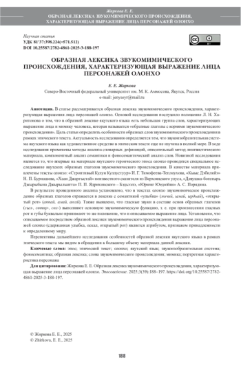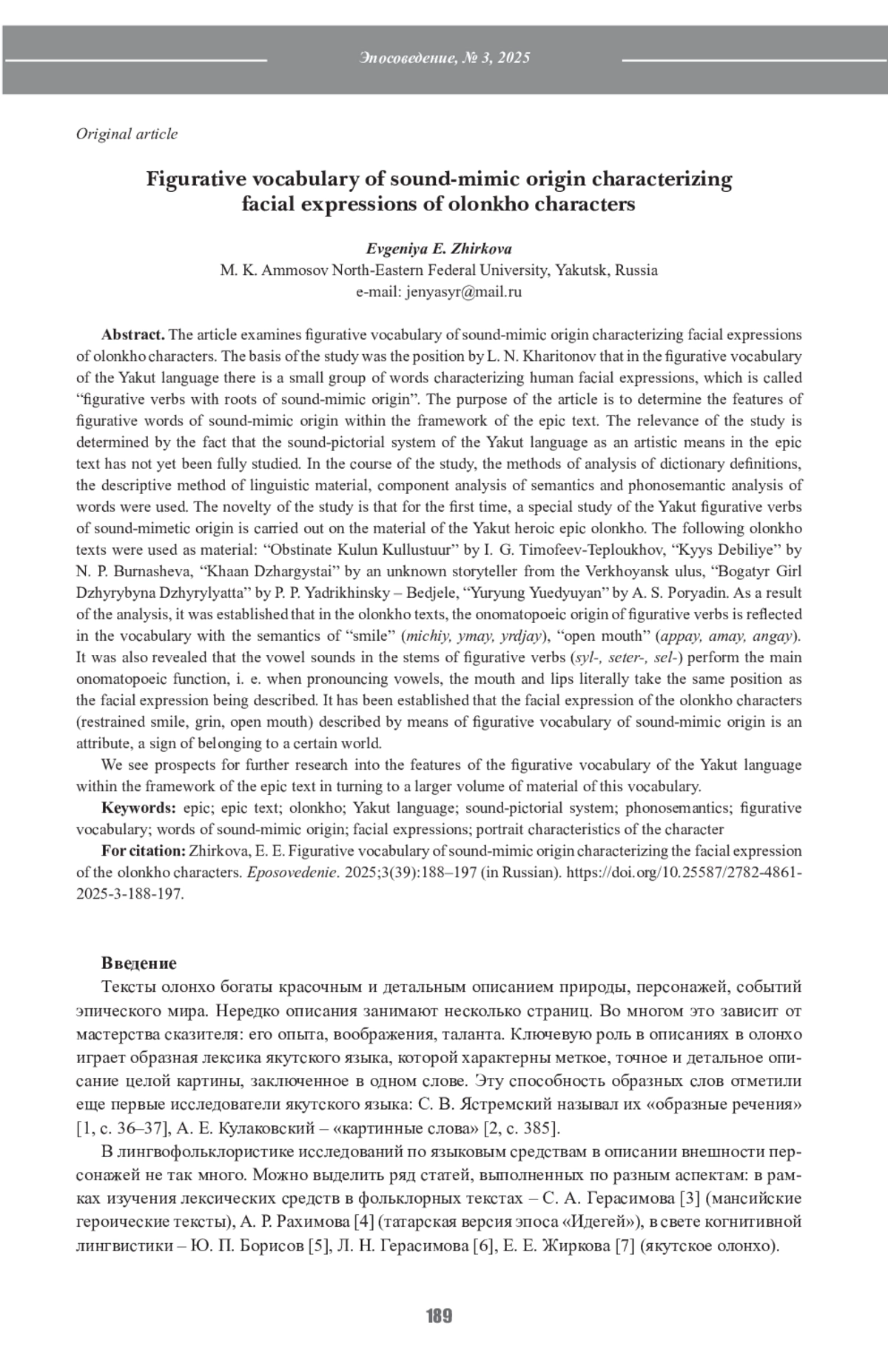 В статье рассматривается образная лексика звукомимического происхождения, характеризующая выражения лица персонажей олонхо. Основой исследования послужило положение Л. Н. Харитонова о том, что в образной лексике якутского языка есть небольшая группа слов, характеризующих выражение лица и мимику человека, которая называется «образные глаголы с корнями звукомимического происхождения». Цель статьи определить особенности образных слов звукомимического происхождения в рамках эпического текста. Актуальность исследования определяется тем, что звукоизобразительная система якутского языка как художественное средство в эпическом тексте еще не изучена в полной мере. В ходе исследования применены методы анализа словарных дефиниций, описательный метод лингвистического материала, компонентный анализ семантики и фоносемантический анализ слов. Новизной исследования является то, что впервые на материале якутского героического эпоса олонхо проводится специальное исследование якутских образных глаголов звукомимического происхождения. В качестве материала привлечены тексты олонхо: «Строптивый Кулун Куллустуур» И. Г. Тимофеева-Теплоухова, «Кыыс Дэбилийэ» Н. П. Бурнашева, «Хаан Джаргыстай» неизвестного сказителя из Верхоянского улуса, «Девушка-богатырь Джырыбына Джырылыатта» П. П. Ядрихинского – Бэдьээлэ, «Юрюнг Юедюйян» А. С. Порядина.