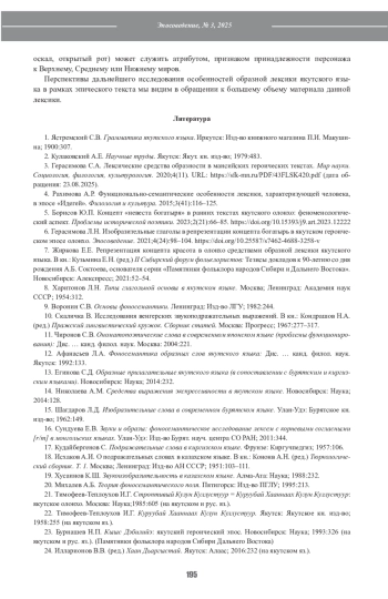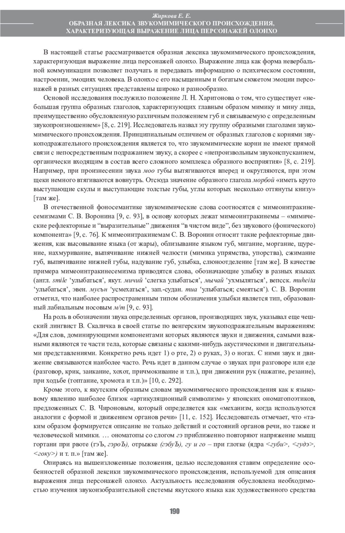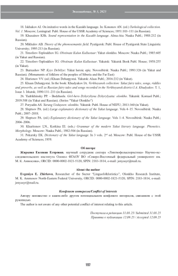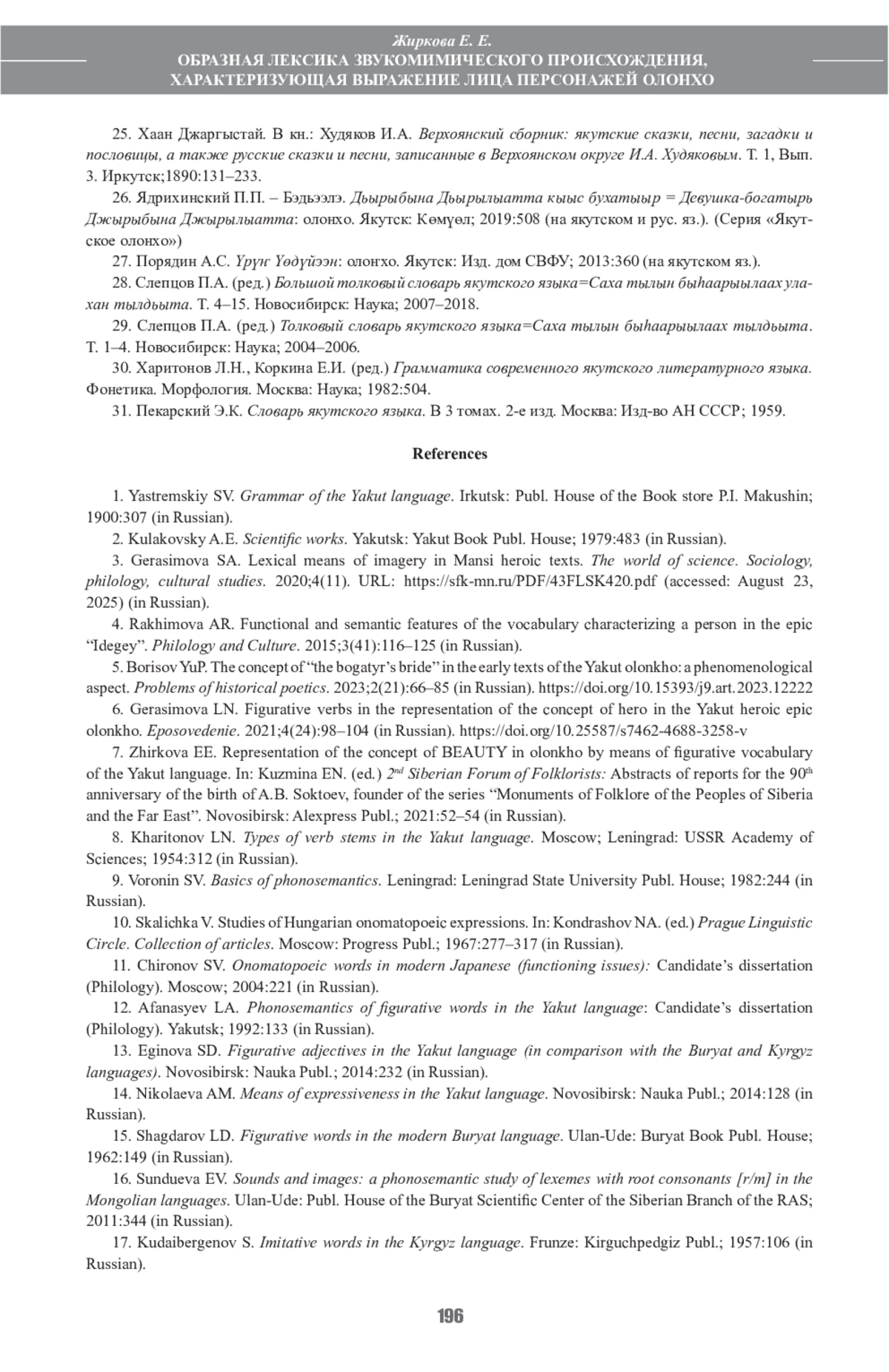 7. Жиркова Е.Е. Репрезентация концепта красота в олонхо средствами образной лексики якутского языка. В кн.: Кузьмина Е.Н. (ред.) II Сибирский форум фольклористов: Тезисы докладов к 90-летию со дня рождения А.Б. Соктоева, основателя серии “Памятники фольклора народов Сибири и Дальнего Востока”. Новосибирск: Алекспресс; 2021:52-54.