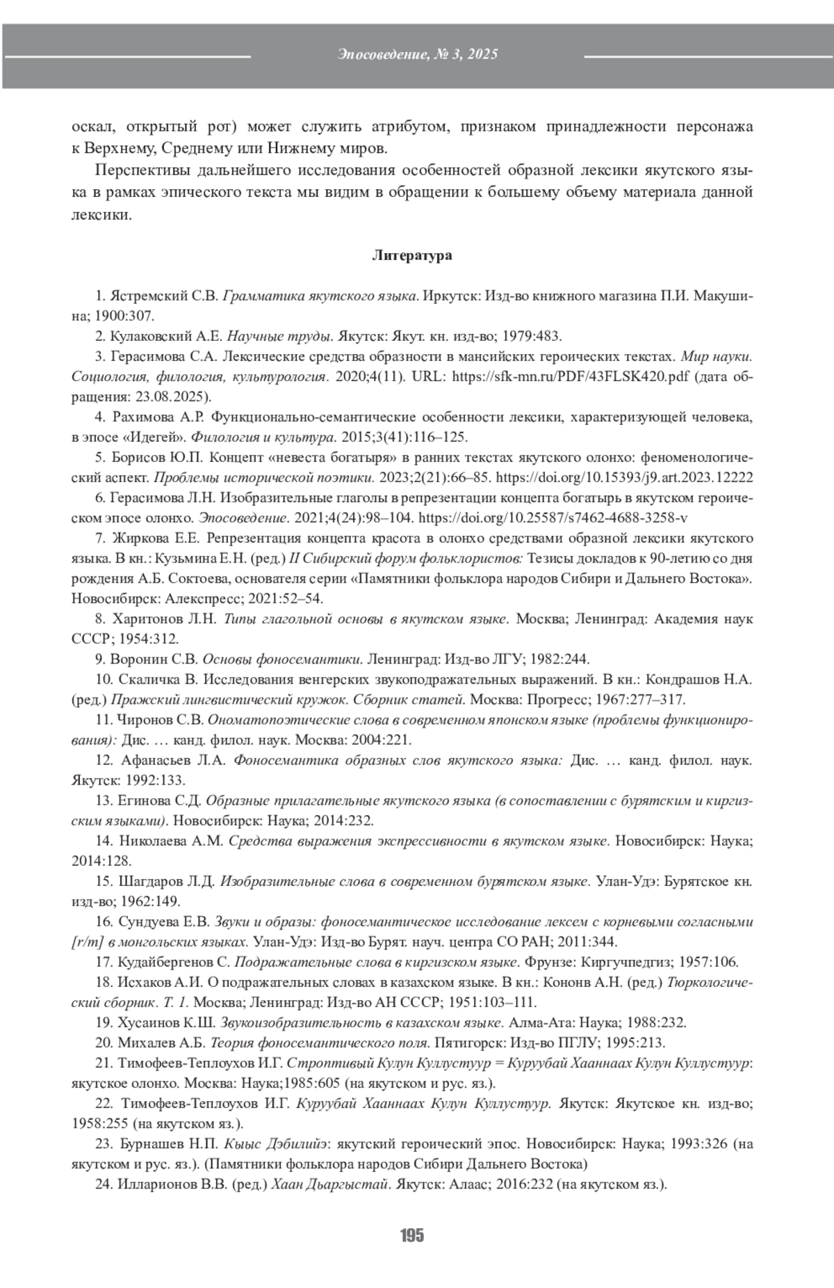 13. Егинова С.Д. Образные прилагательные якутского языка (в сопоставлении с бурятским и киргизским языками). Новосибирск: Наука; 2014:232.