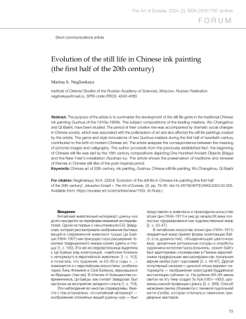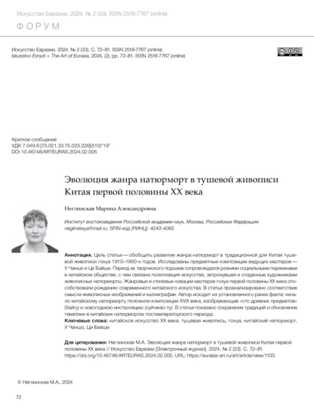 Неглинская М.А. Эволюция жанра натюрморт в тушевой живописи Китая первой половины XX века // Искусство Евразии [Электронный журнал]. 2024. No 2 (33). С. 72–81.