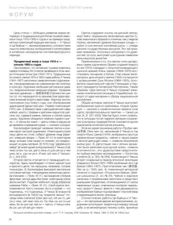 Цель статьи - обобщить развитие жанра натюрморт в традиционной для Китая тушевой живописи гохуа 1910-1950-х годов. Исследованы предметные композиции ведущих мастеров - У Чаншо и Ци Байши. Период их творческого подъема сопровождался резкими социальными переменами в китайском обществе, с чем связана политизация искусства, затронувшая и созданные художниками живописные натюрморты. Жанровые и стилевые новации мастеров гохуа первой половины ХХ века способствовали рождению современного китайского искусства. В статье проанализировано соответствие смысла живописных изображений и каллиграфии. Автор исходит из установленного ранее факта: начало китайскому натюрморту положили композиции XVIII века, изображающие «сто древних предметов» (байгу) и новогоднюю инсталляцию (суйчжао-ту). В статье показано сохранение традиций и обновление тематики в китайских натюрмортах постимператорского периода.