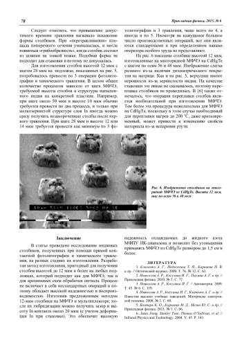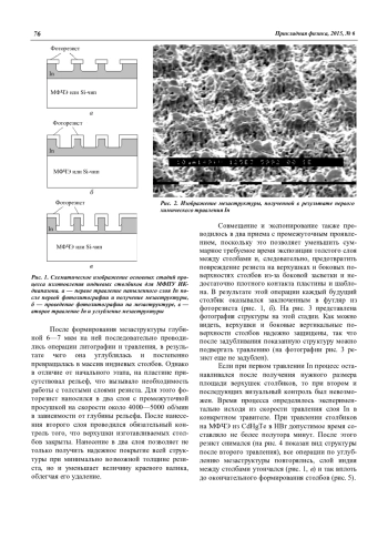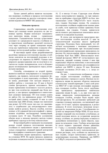 В статье проведено исследование индиевых столбиков, полученных при помощи прямой контактной фотолитографии и химического травления, на разных стадиях их изготовления. Разработан метод изготовления, пригодный для получения столбов высотой до 12 мкм и более на любых подложках, который подходит как для МФЧЭ, так и для кремниевых схем обработки сигнала. Процесс не включает в себя нестандартных операций и поэтому обладает высокой надежностью и воспроизводимостью. Изготовив предложенным методом 12-мкм столбики на МФЧЭ и мультиплексоре, после их гибридизации можно получить зазор и высоту In контакта около 20 мкм (с учетом деформации In при стыковке). Это обеспечит высокую надежность охлаждаемых до жидкого азота МФПУ ИК-диапазона и позволит без утоньшения применять МФЧЭ из CdHgTe размером до 1,5 см и более.