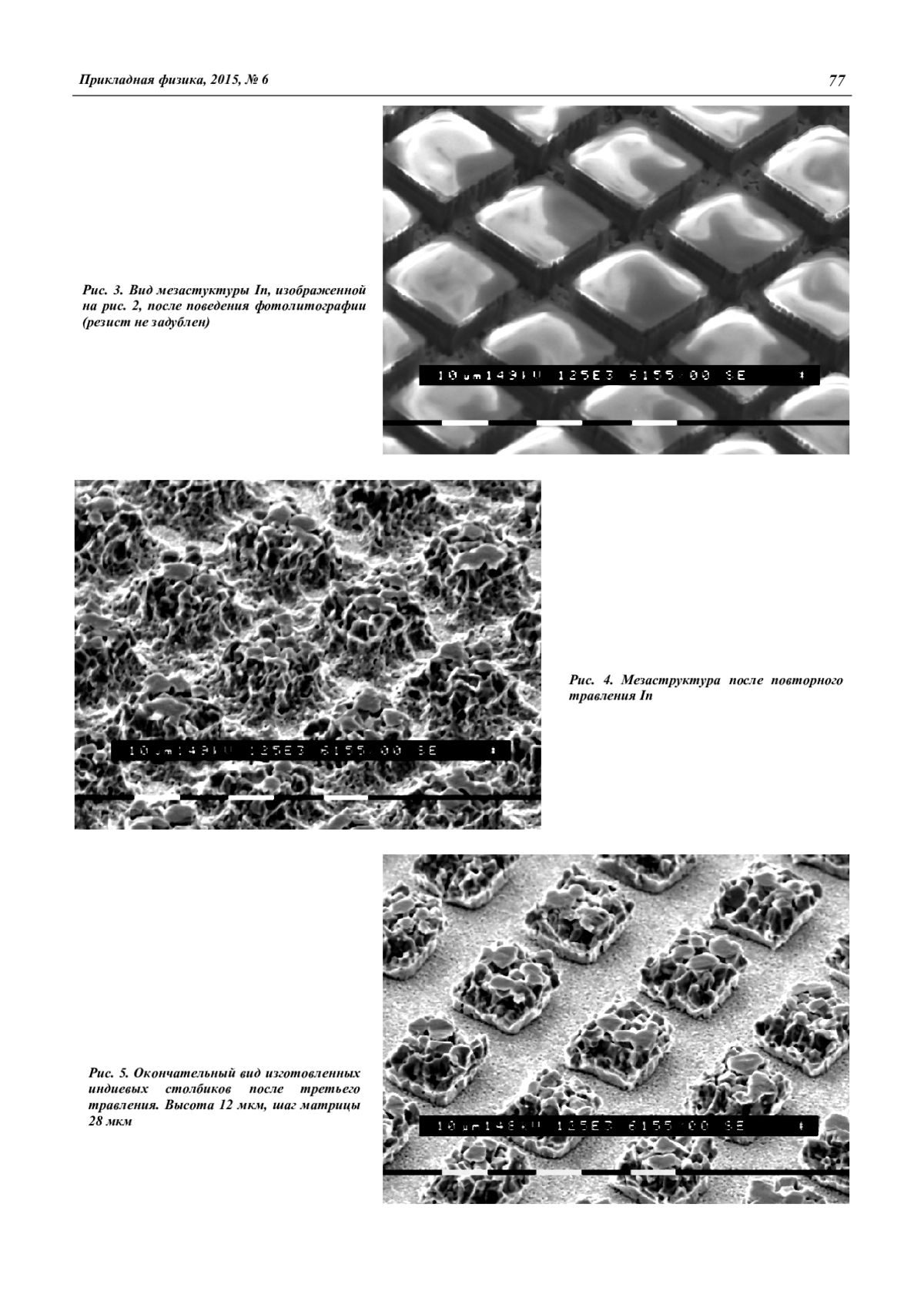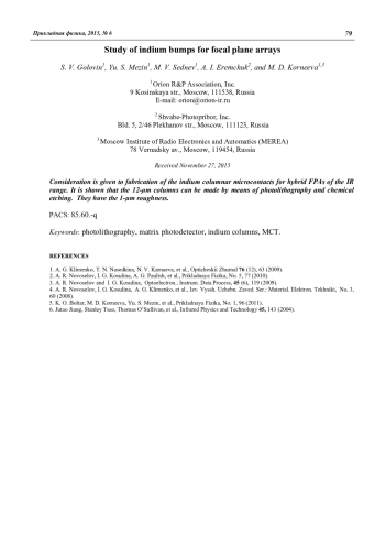 Исследованы индиевые столбчатые микроконтакты для гибридных матричных фотоприемных устройств (МФПУ) инфракрасного диапазона, состоящих из матрицы фоточувствительных элементов и кремниевого мультиплексора, состыкованных между собой. Показано, что индиевые столбики высотой 12 микрометров и более могут быть получены посредством последовательного проведения стандартных операций фотолитографии и химического травления, имеют шероховатость порядка 1 мкм и могут использоваться для операции стыковки в процессе изготовления МФПУ.