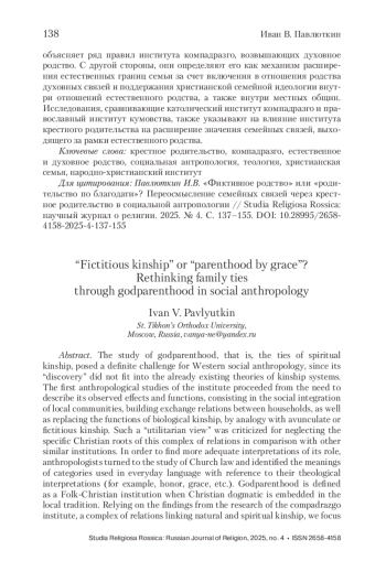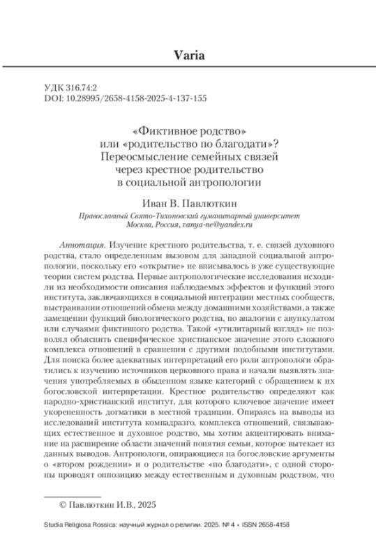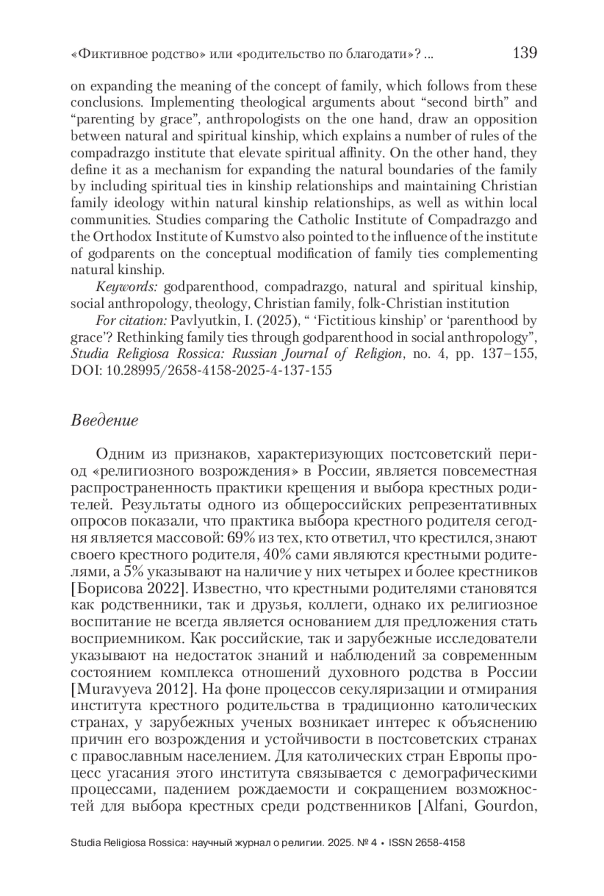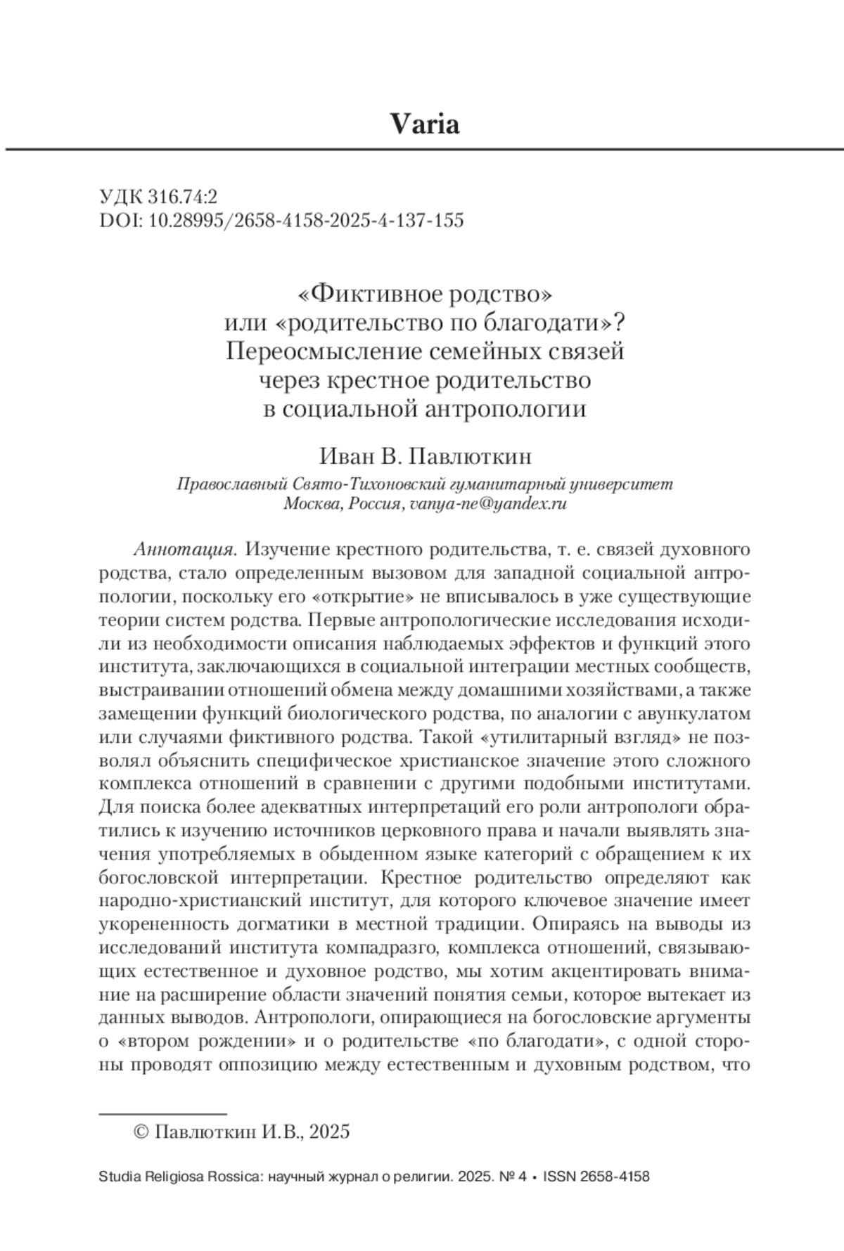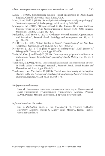 5. Павлюткин, Зуева 2024 - Павлюткин И.В., Зуева А.В. Сетевые исследования крестного родительства: возможности и ограничения // Научный результат: Социология и управление. 2024. Т. 10. № 1. С. 121-132.