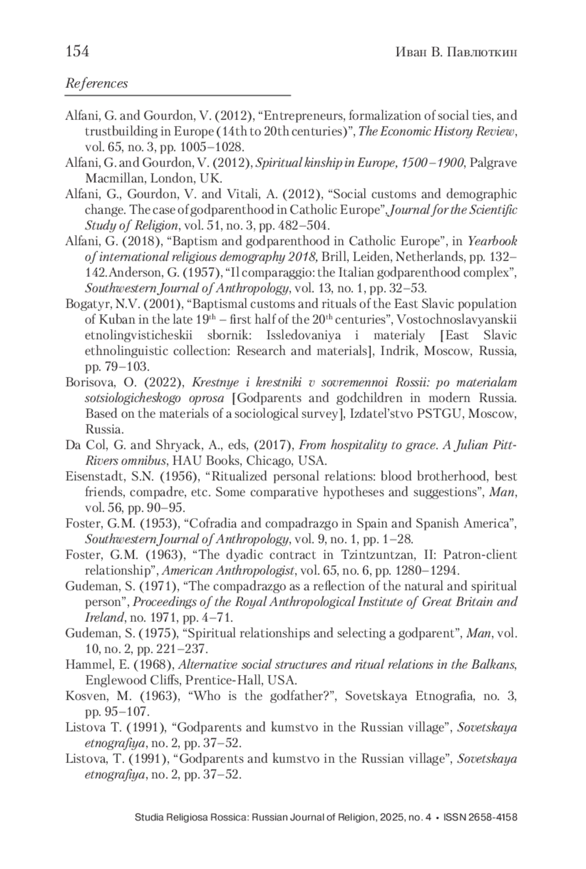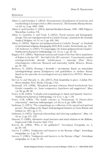 12. Anderson 1957 - Anderson G. Il comparaggio: the Italian godparenthood complex // Southwestern Journal of Anthropology. 1957. Vol. 13. No. 1. P. 32-53.