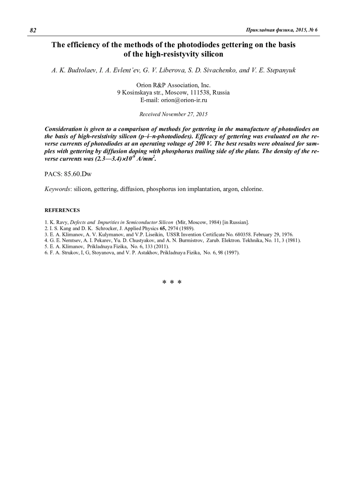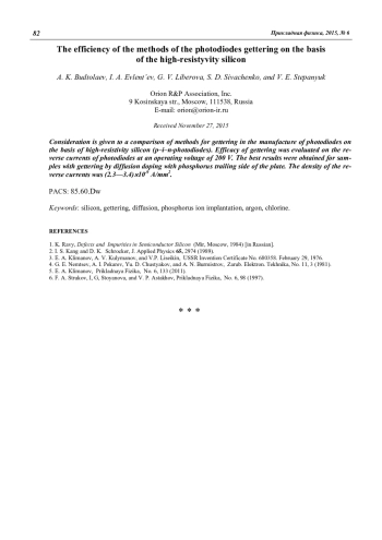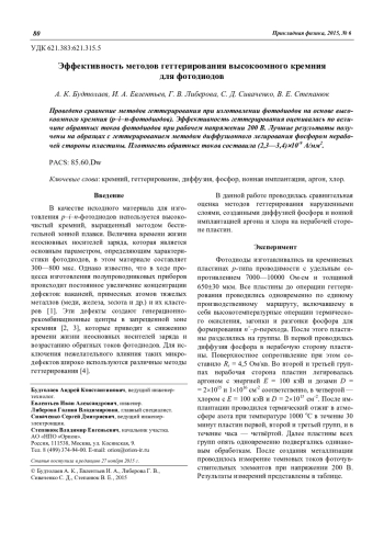 Будтолаев А. К., Евлентьев И. А., Либерова Г. В., Сиваченко С. Д., Степанюк В. Е. Эффективность методов геттерирования высокоомного кремния для фотодиодов 80