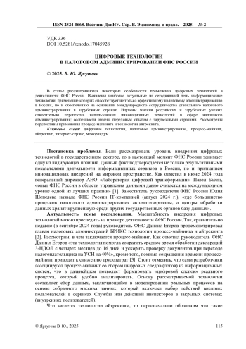 В статье рассматриваются некоторые особенности применения цифровых технологий в деятельности ФНС России. Выявлены наиболее актуальные на сегодняшний день информационные технологии, применение которых способствует не только эффективному налоговому администрированию в России, но и обеспечению на основании международного сотрудничества стабильного налогового администрирования в зарубежных странах. Изучены мнения российских и зарубежных ученых относительно перспектив использования инновационных технологий в сфере налогового администрирования; особенности обмена передовым опытом с зарубежными странами. Рассмотрены перспективы применения процесс-майнинга и технологии айтрекинга.
