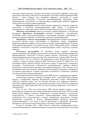15. Достижения в области цифровизации налогового администрирования обсудили руководители налоговых служб России и ОАЭ / Официальный сайт ФНС России. URL: https://www.nalog.gov.ru/rn77/about_fts/inttax/14564269/(дата обращения: 11.03.2025).