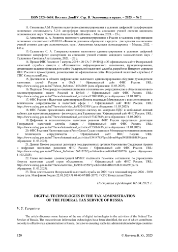 13. Сульженко С. А. Совершенствование налогового администрирования в условиях цифровой экономики: автореферат диссертации на соискание ученой степени кандидата экономических наук / Сульженко Светлана Анатольевна, 2023. - 26 с. EDN: FABZKQ