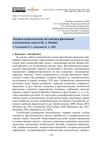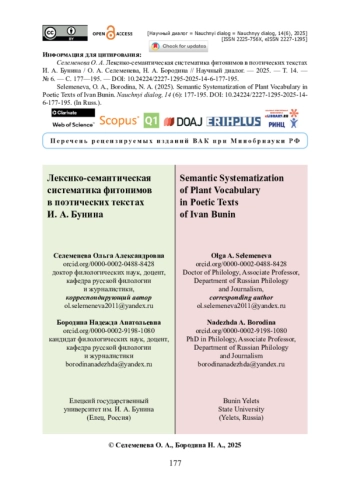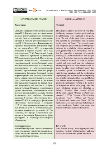 Статья посвящена проблеме писательского языка И. А. Бунина, в частности фитонимическому инструментарию его поэтических текстов. Цель исследования — систематизировать и описать фитонимическую лексику И. А. Бунина-поэта. Фактическим материалом исследования выступили лирические тексты (более 900 стихотворений), вошедшие в научное издание 2014 года, подготовленное Т. М. Двинятиной. Авторская картотека примеров сформирована 237 номинациями растений. При их интерпретации использовались описательный, таксономический, дистрибутивный, лингвостатистический методы, а также методы компонентного и контекстологического анализа. Определены три принципа, упорядочивающие фитонимы бунинской поэзии и организующие их в систему: соподчиненность единиц, многоступенчатость структуры, сочетание политомии и дихотомии при выделении таксонов на разных уровнях. Установлено, что в поэзии И. А. Бунина присутствует 22 лексико-семантических группы фитонимов, отличающихся количеством наименований в составе группы. Установлено, что наиболее объемными являются 4 группы: «Партитивные фитонимы» (22,4 % всего корпуса фитонимов), «Фитонимы растительных сообществ» (12,7 %), «Фитонимы неплодовых лиственных деревьев» (10,6 %) и «Фитонимы декоративных травянистых растений» (8,5 %). Показано, что наряду с узуальными единицами в фитонимии Бунина-поэта функционируют и индивидуально-авторские образования.