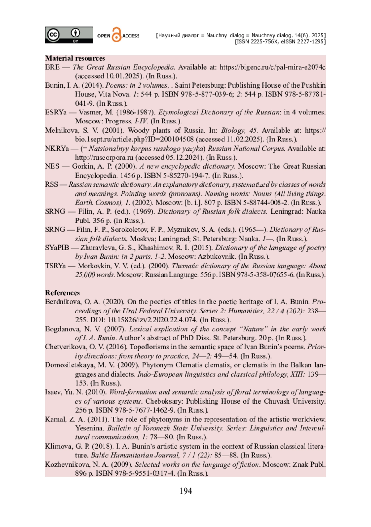 1. Бердникова О. А. К вопросу о поэтике заглавий в стихотворном наследии И. А. Бунина. / О. А. Бердникова // Известия Уральского федерального университета. Серия 2 : Гуманитарные науки. - 2020. - Т. 22. - № 4 (202). - С. 238-255. - https://doi.org/10.15826/izv2.2020.22.4.074.