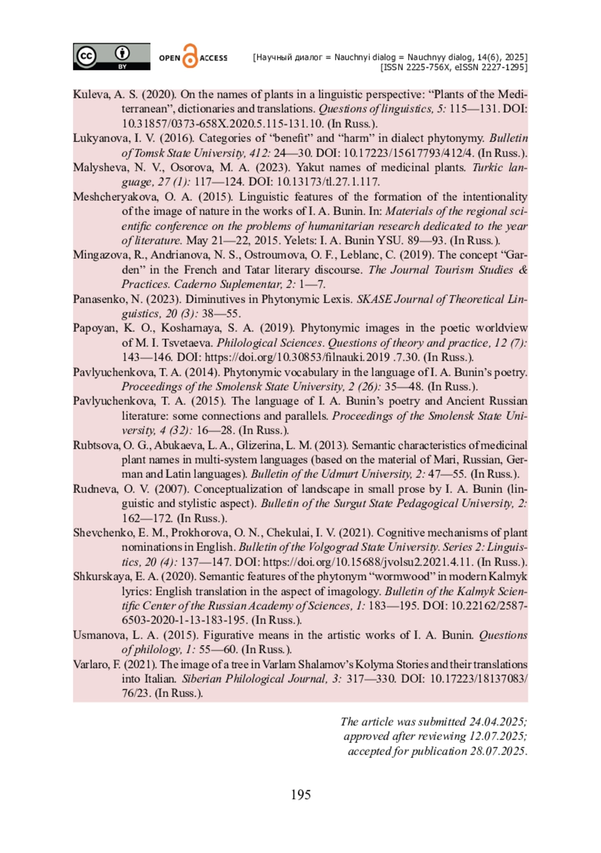 9. Кулева А. С. О названиях растений в лингвистической перспективе : «Растения Средиземноморья», словари и переводы / А. С. Кулева // Вопросы языкознания. - 2020. - № 5. - С. 115-131. - https://doi.org/10.31857/0373-658X.2020.5.115-131.