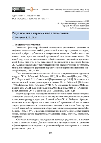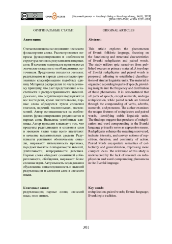 Статья посвящена исследованию эвенского фольклорного слова. Рассматриваются вопросы функционирования и особенности структуры эвенских редупликатов и парных слов. В качестве материалов привлекаются эпические сказания из опубликованных источников. Предложена типология эвенских редупликатов и парных слов согласно признанным классификациям подобных единиц. Материал распределен по частеречному принципу, что дает представление о частотности и распространенности явлений. Доказано, что редупликации подвергаются все части речи, кроме числительного, парные слова образуются путем сложения глаголов, наречий, числительных, местоимений. Автор останавливается на особенностях функционирования редупликатов и парных слов. Выявлены устойчивые единицы. Автор приходит к выводу о том, что продукты редупликации и сложения слов в эвенском языке чаще всего выступают в качестве выразительных средств. Редупликаты усиливают обозначаемые смыслы, выражают интенсивность признака, передают понятие повторяемости явлений, длительности, непрерывности действия. Парные слова обладают семантикой собирательности, обобщения, выражают более сложные идеи. Актуальность исследования обусловлена неисследованностью явлений редупликации и сложения слов в эвенском языке.