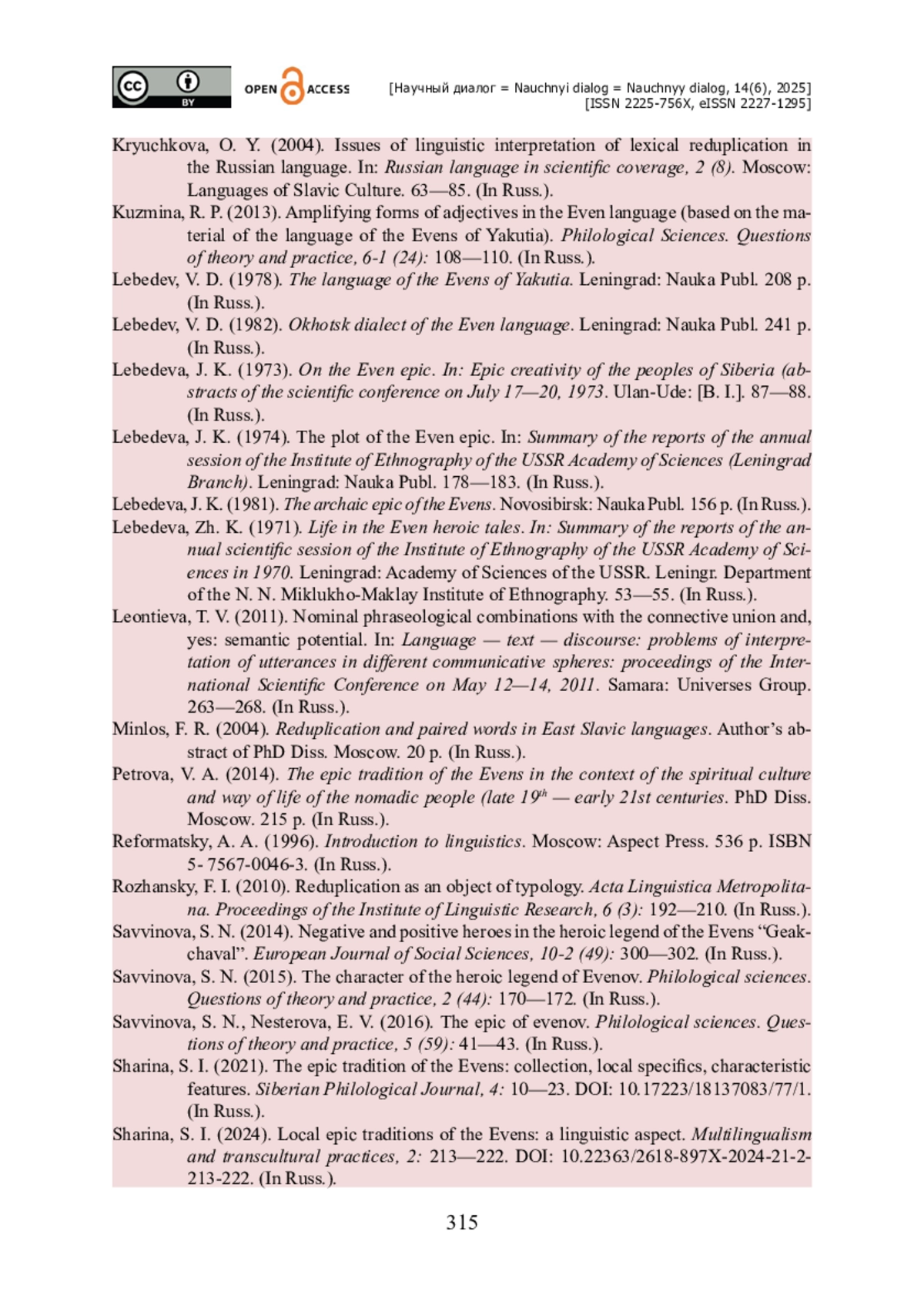 27. Шарина С. И. Локальные эпические традиции эвенов : лингвистический аспект / С. И. Шарина // Полилингвальность и транскультурные практики. - 2024. - № 2. - С. 213-222. - https://doi.org/10.22363/2618-897X-2024-21-2-213-222.
