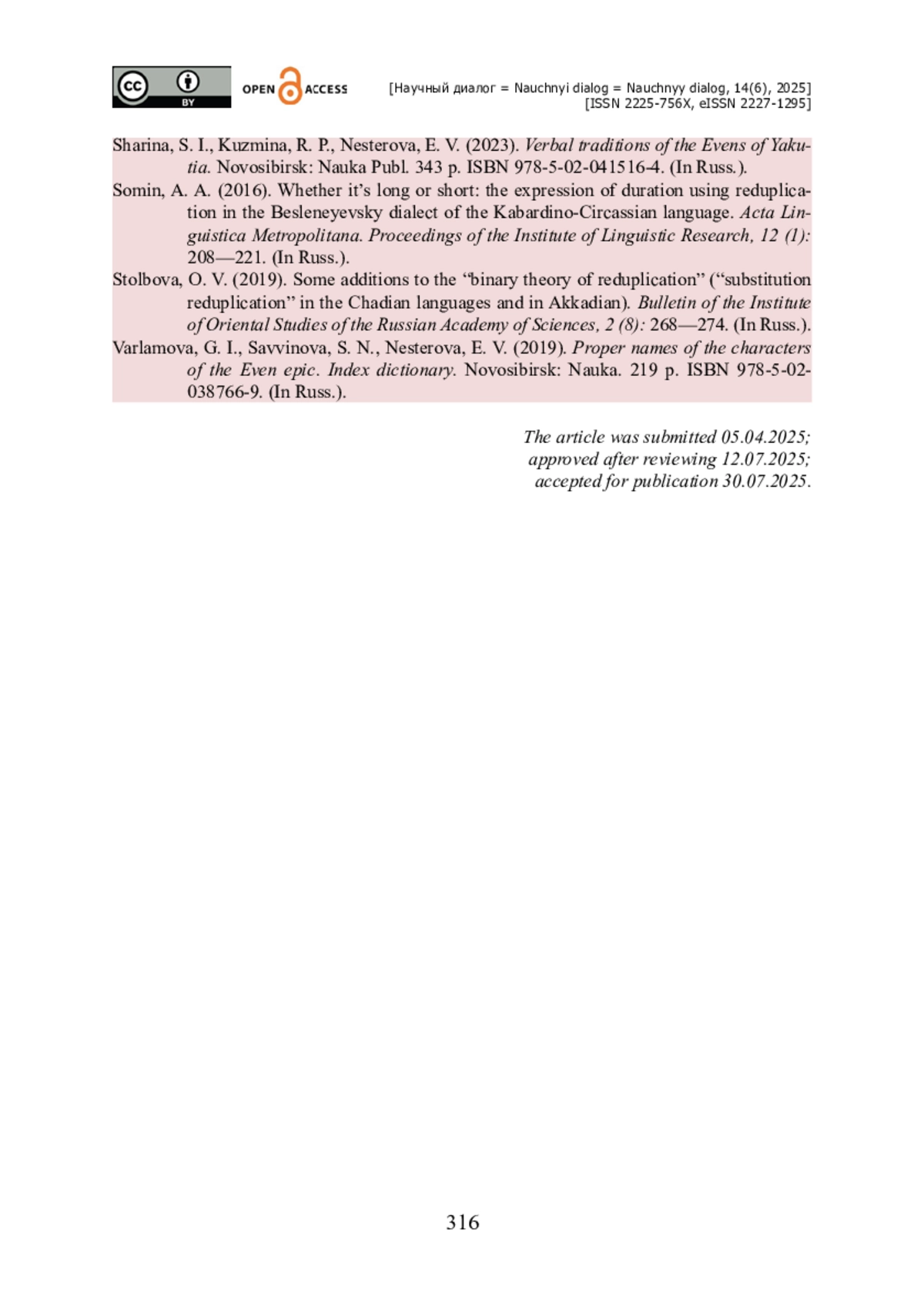 23. Сомин А. А. Долго ли, коротко ли: выражение длительности с помощью редупликации в бесленеевском диалекте кабардино-черкесского языка / А. А. Сомин // Acta Linguistica Petropolitana. Труды института лингвистических исследований. - 2016. - Т. 12. - № 1. - С. 208-221.