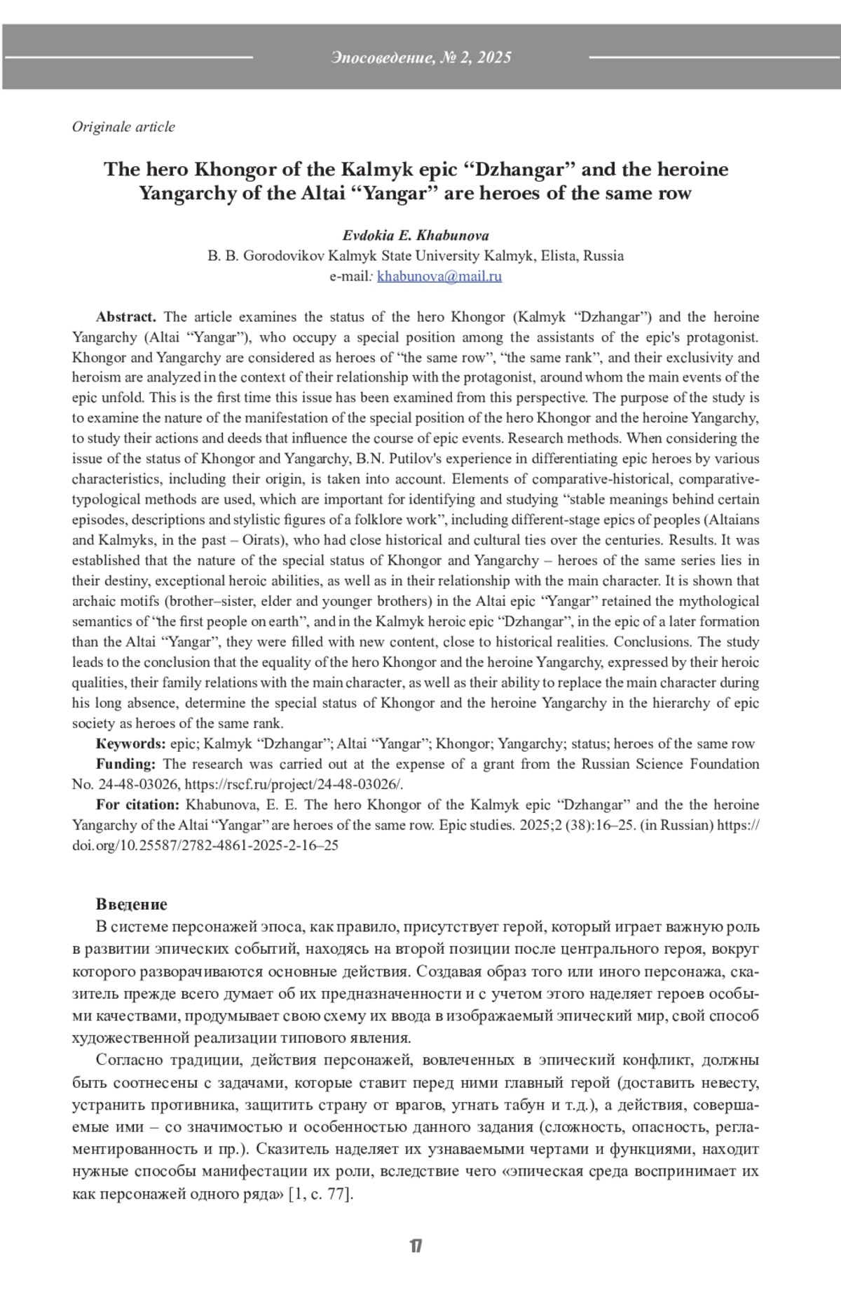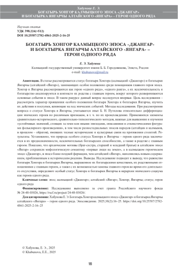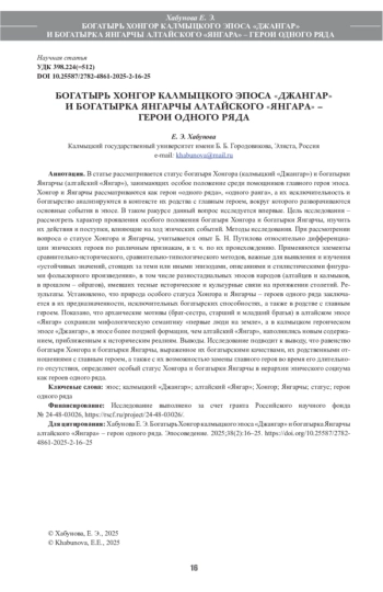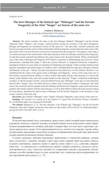 В статье рассматривается статус богатыря Хонгора (калмыцкий «Джангар») и богатырки Янгарчы (алтайский «Янгар»), занимающих особое положение среди помощников главного героя эпоса. Хонгор и Янгарчы рассматриваются как герои «одного ряда», «одного ранга», а их исключительность и богатырство анализируются в контексте их родства с главным героем, вокруг которого разворачиваются основные события в эпосе. В таком ракурсе данный вопрос исследуется впервые. Цель исследования – рассмотреть характер проявления особого положения богатыря Хонгора и богатырки Янгарчы, изучить их действия и поступки, влияющие на ход эпических событий. Методы исследования. При рассмотрении вопроса о статусе Хонгора и Янгарчы, учитывается опыт Б. Н. Путилова относительно дифференциации эпических героев по различным признакам, в т. ч. по их происхождению. Применяются элементы сравнительно-исторического, сравнительно-типологического методов, важные для выявления и изучения «устойчивых значений, стоящих за теми или иными эпизодами, описаниями и стилистическими фигурами фольклорного произведения», в том числе разностадиальных эпосов народов (алтайцев и калмыков, в прошлом – ойратов), имевших тесные исторические и культурные связи на протяжении столетий. Результаты. Установлено, что природа особого статуса Хонгора и Янгарчы – героев одного ряда заключается в их предназначенности, исключительных богатырских способностях, а также в родстве с главным героем. Показано, что архаические мотивы (брат-сестра, старший и младший братья) в алтайском эпосе «Янгар» сохранили мифологическую семантику «первые люди на земле», а в калмыцком героическом эпосе «Джангар», в эпосе более поздней формации, чем алтайский «Янгар», наполнились новым содержанием, приближенным к историческим реалиям. Выводы. Исследование подводит к выводу, что равенство богатыря Хонгора и богатырки Янгарчы, выраженное их богатырскими качествами, их родственными отношениями с главным героем, а также с их возможностью замены главного героя во время его длительного отсутствия, определяют особый статус Хонгора и богатырки Янгарчы в иерархии эпического социума как героев одного ряда.