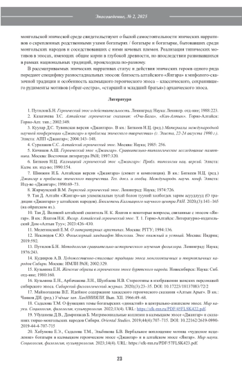 16. Кузьмина Е.Н., Арбачакова Л.Н., Шулбаева Н.В. Стереотипы в изображении женских персонажей сибирского эпоса. Сибирский филологический журнал. 2020;(3):23-35. DOI: 10.17223/18137083/72/2 EDN: DSJGGZ