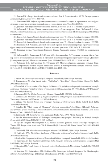 20. Хабунова Е.Э., Садалова Т.М., Эльбикова Б.В. Вербальное воплощение мотива “чудесное исцеление” богатыря в калмыцком героическом эпосе “Джангар” и в алтайском эпосе “Янгар”. Мир науки. Социология, филология, культурология. 2023;14(4). URL: https://sfk-mn.ru/PDF/57FLSK423.pdf.