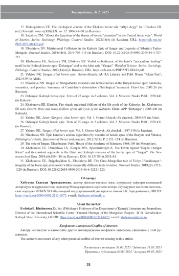 19. Убушиева Д.В., Дамринжав Б. Матримониальные коллизии в калмыцком эпосе “Джангар” и сказаниях тюрко-монгольских народов Сибири. Oriental Studies. 2019;44(4):707-715. DOI: 10.22162/2619-0990-2019-44-4-707-715