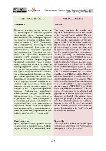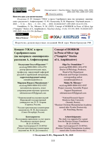 Изучается новеллистическое творчество А. Амфитеатрова в контексте традиции «вампирской» прозы. Научная новизна статьи состоит в том, что впервые в рассказах писателя изучается специфика репрезентации концепта УЖАС. Установлено, что в новеллистике Амфитеатрова ужас порожден тотальной безысходностью и невозможностью понимания происходящего персонажами. Отмечается, что в рассказе «Он» средствами репрезентации концепта УЖАС становятся готический хронотоп и вампир, который нарушает привычный жизненный уклад и способствует помещению героя в пространство неконтролируемого ужаса, соединенного со страстью и стремлением максимальной близости с объектом влечения. Показано, что в «Киммерийской болезни» и в «Истории одного сумасшествия» воплощение исследуемого концепта происходит через фигуру вампира, который оказывается аллюзией к персонажу поэмы «Коринфская невеста». Авторы приходят к выводу, что концепт УЖАС в проанализированных новеллах Амфитеатрова способствует формированию дискурса анормального, психопатического в русской литературе Серебряного века: герои, столкнувшиеся с инфернальной силой, испытывают патологический ужас — от невозможности определить границы реального и ирреального, рационального и иррационального, а также от осознания дезориентации в «реальном» мире и в итоге — потери себя.