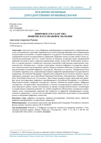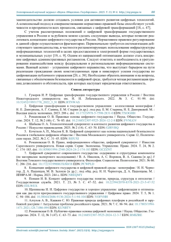 3. Романовская О. В. Правовые основы цифрового государства // Наука. Общество. Государство. 2024. Т. 12, № 2 (46). С. 76-85. DOI: 10.21685/2307-9525-2024-12-2-8 EDN: FVNLGV