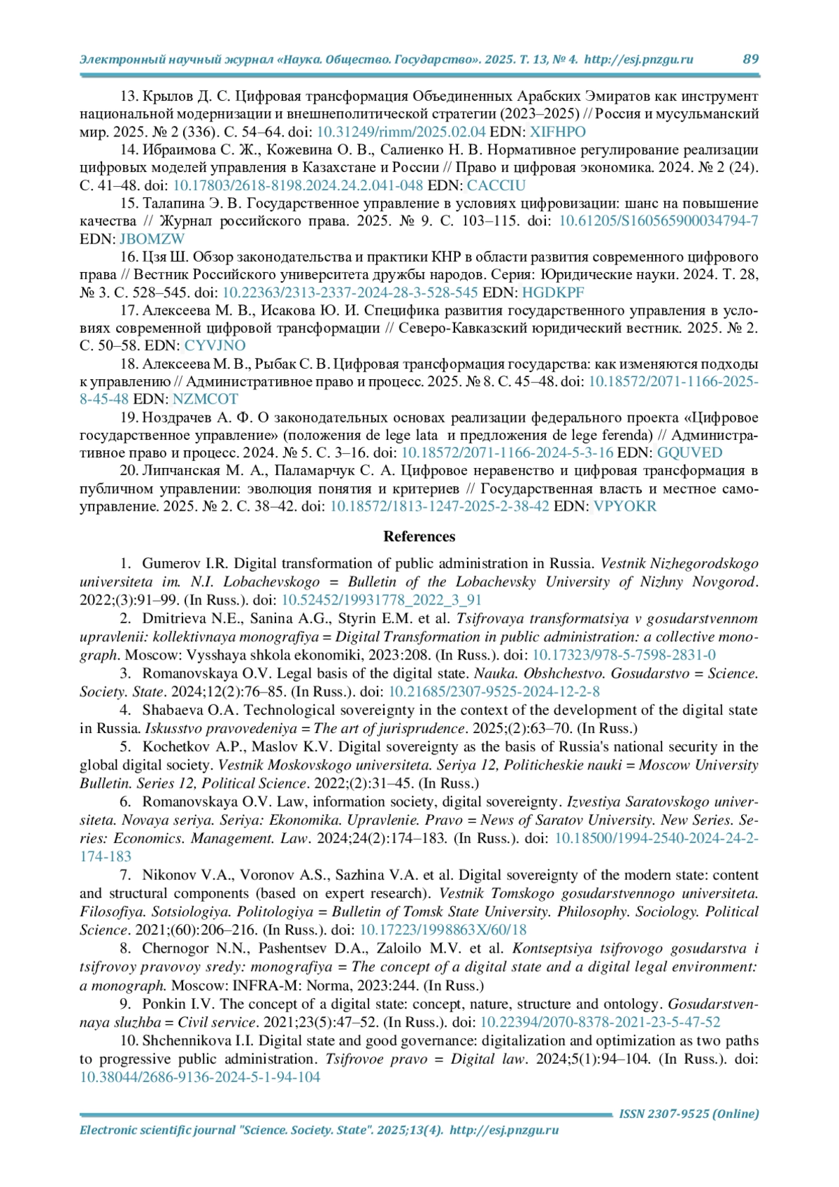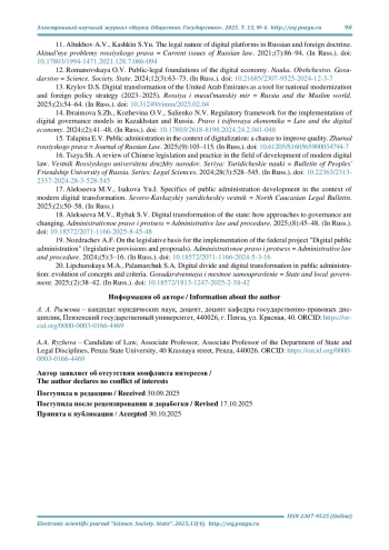 15. Талапина Э. В. Государственное управление в условиях цифровизации: шанс на повышение качества // Журнал российского права. 2025. № 9. С. 103-115. DOI: 10.61205/S160565900034794-7 EDN: JBOMZW