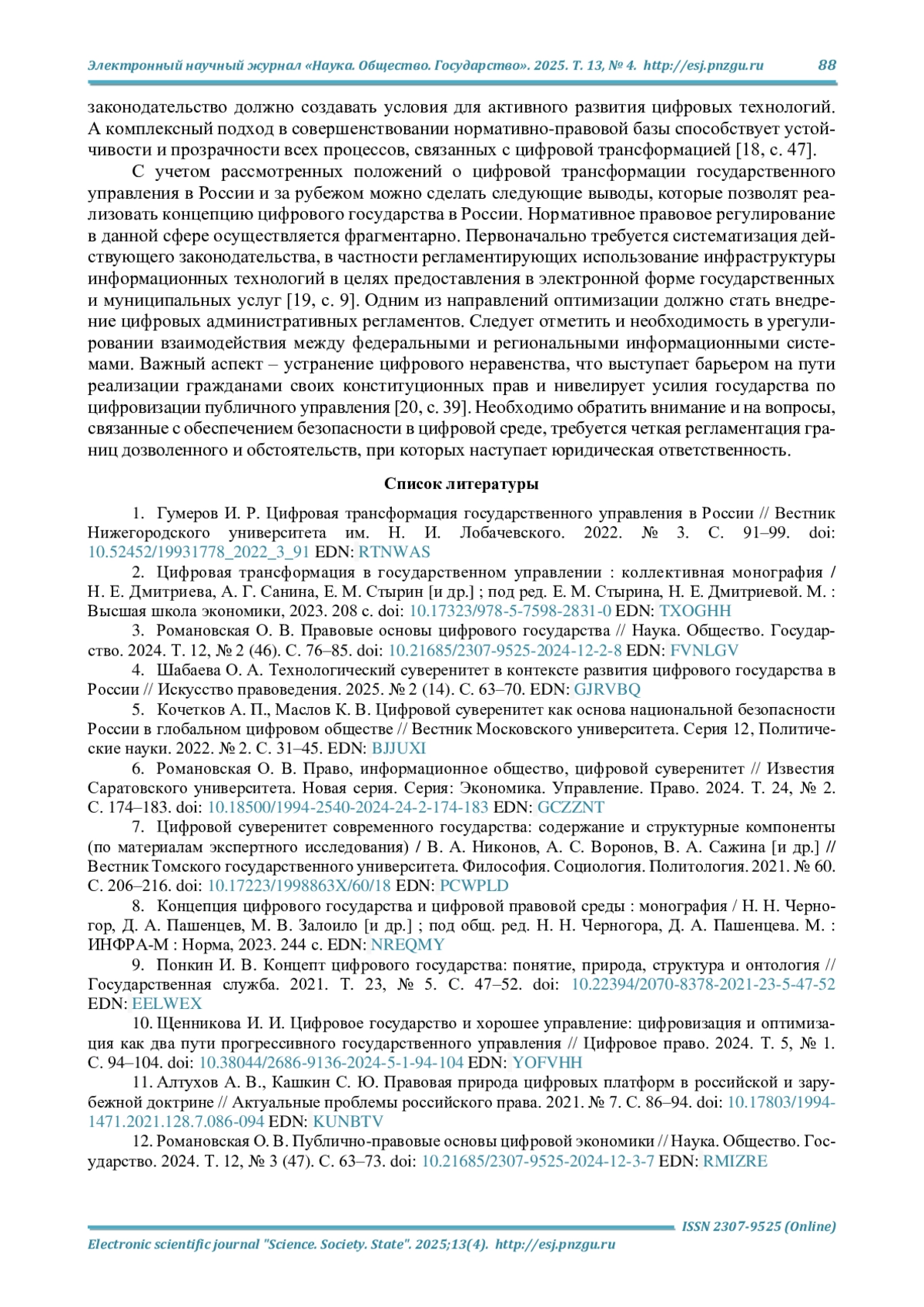 12. Романовская О. В. Публично-правовые основы цифровой экономики // Наука. Общество. Государство. 2024. Т. 12, № 3 (47). С. 63-73. DOI: 10.21685/2307-9525-2024-12-3-7 EDN: RMIZRE