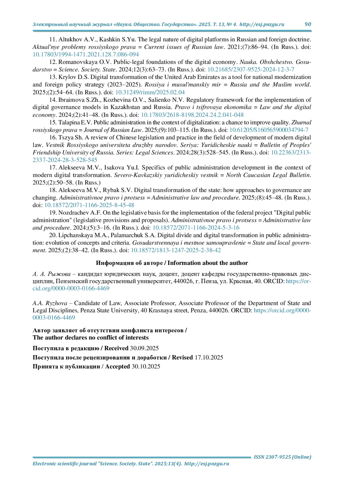 18. Алексеева М. В., Рыбак С. В. Цифровая трансформация государства: как изменяются подходы к управлению // Административное право и процесс. 2025. № 8. С. 45-48. DOI: 10.18572/2071-1166-2025-8-45-48 EDN: NZMCOT