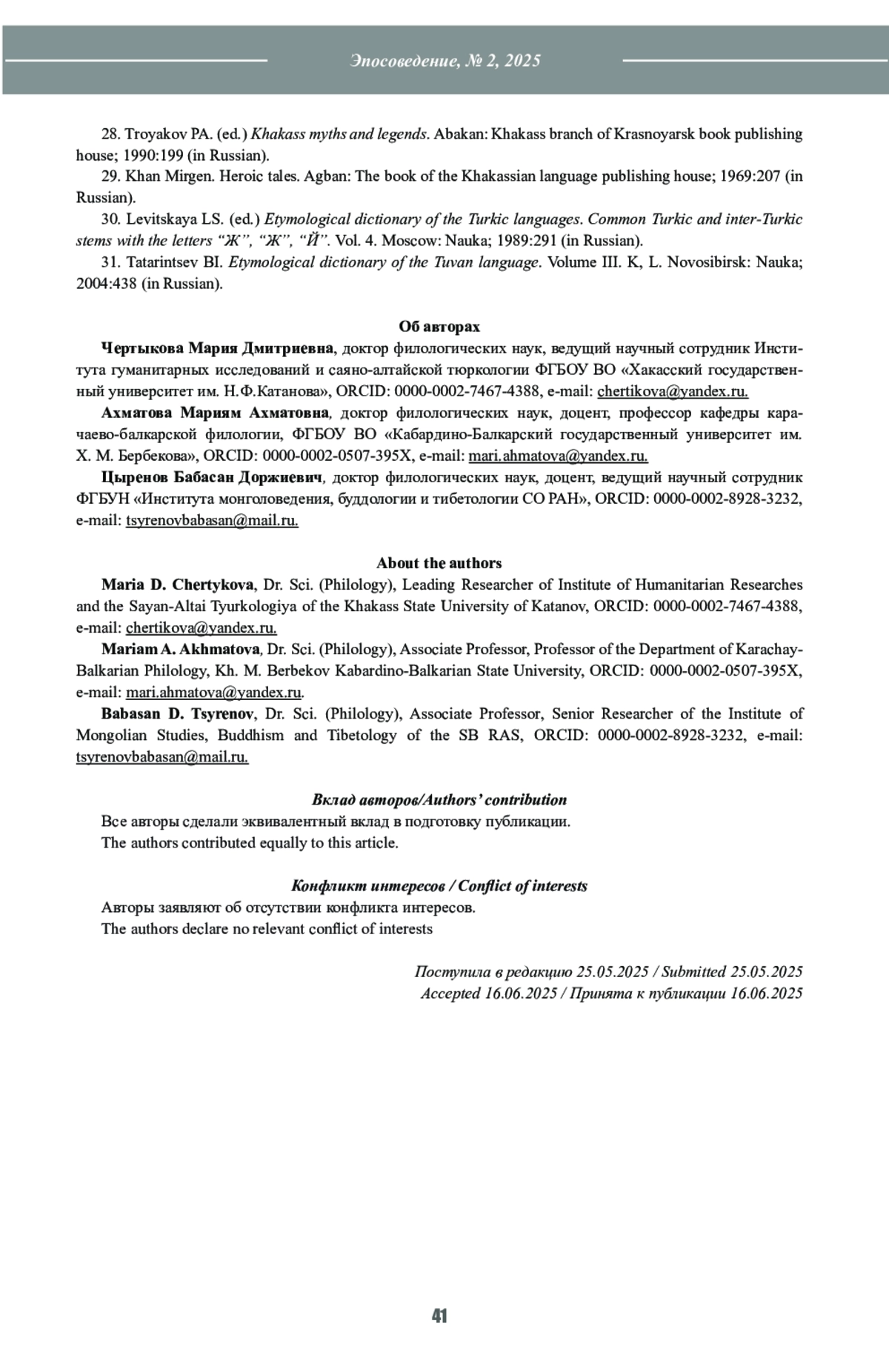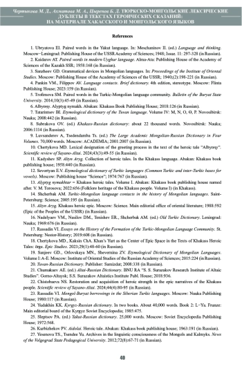В результате выявлено, что подобные дублетные пары представляют собой отдельный лексический пласт в системе парных слов. Рассматриваемые нами хакасско-монгольские парные дублеты имеют свои характерные лексико-семантические особенности, в частности, в сочетаемостном плане находятся в равноправных (симметричных) и подчинительных отношениях. Они не допускают перестановки слов и внедрения других слов, за исключением некоторых вариантов традиционных клишированных конструкций, которые выполняют определенную синтаксическую функцию. Такие слова являются компонентами нескольких вариантов клишированных предложений. Заимствованные монголизмы, как правило, в хакасском языке не используются как отдельные лексические единицы, хоть они и фиксируются в словаре, но находятся в пассивной сфере языка или же переходят в разряд устаревших и фольклорных слов. В фольклорной системе тюркских и монгольских народов имеется немало перекликающихся концептуальных полей, примером которых является и наш материал. Считаем, что данная тематика имеет хороший лингвофольклористический потенциал и перспективу для будущих исследований на материале других тюркских и монгольских языков и жанров устного народного творчества.