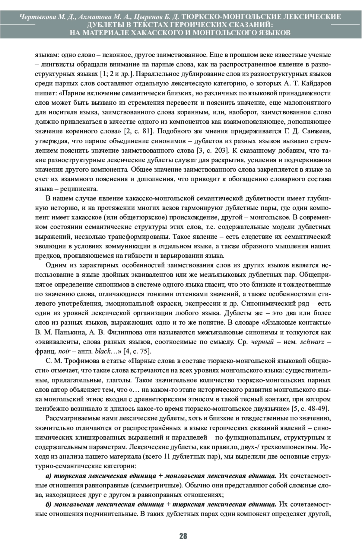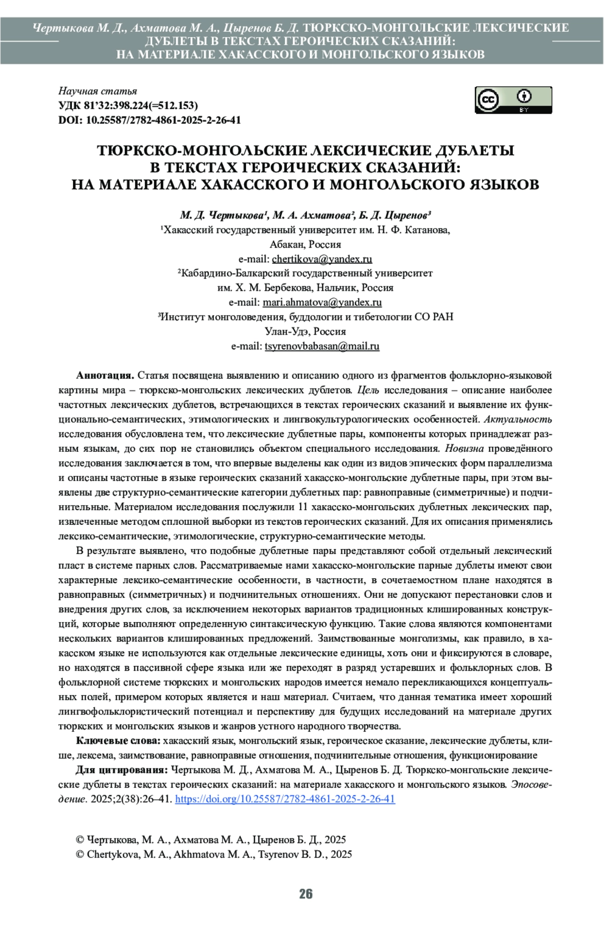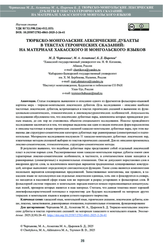 Статья посвящена выявлению и описанию одного из фрагментов фольклорно-языковой картины мира – тюркско-монгольских лексических дублетов. Цель исследования – описание наиболее частотных лексических дублетов, встречающихся в текстах героических сказаний и выявление их функционально-семантических, этимологических и лингвокультурологических особенностей. Актуальность исследования обусловлена тем, что лексические дублетные пары, компоненты которых принадлежат разным языкам, до сих пор не становились объектом специального исследования. Новизна проведённого исследования заключается в том, что впервые выделены как один из видов эпических форм параллелизма и описаны частотные в языке героических сказаний хакасско-монгольские дублетные пары, при этом выявлены две структурно-семантические категории дублетных пар: равноправные (симметричные) и подчинительные. Материалом исследования послужили 11 хакасско-монгольских дублетных лексических пар, извлеченные методом сплошной выборки из текстов героических сказаний. Для их описания применялись лексико-семантические, этимологические, структурно-семантические методы.