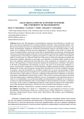 Выводы. Показана необходимость формирования правовой культуры как составляющей профессиональной компетентности специалистов в сфере стандартизации и метрологии. Отмечается целесообразность проведения внутренней и внешней оценки полученных знаний и опросов по удовлетворенности для участников образовательного процесса. В качестве внешней оценки рекомендуется использовать профессионально-общественную и международную аккредитации. Центром ответственности по разработке учебных планов, координации деятельности по созданию методических материалов при обучении студентов является выпускающая кафедра образовательной организации. Отмечается необходимость тесной кооперации с предприятиями.