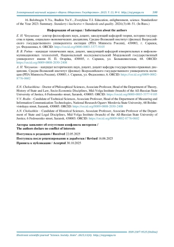 16. Белобрагин В. Я., Будкин Ю. В., Зворыкина Т. И. Обучение, просвещение, наука. Стандартизатор года - 2023: Итоги // Стандарты и качество. 2024. № 3. С. 46-51. EDN: EVAFIH