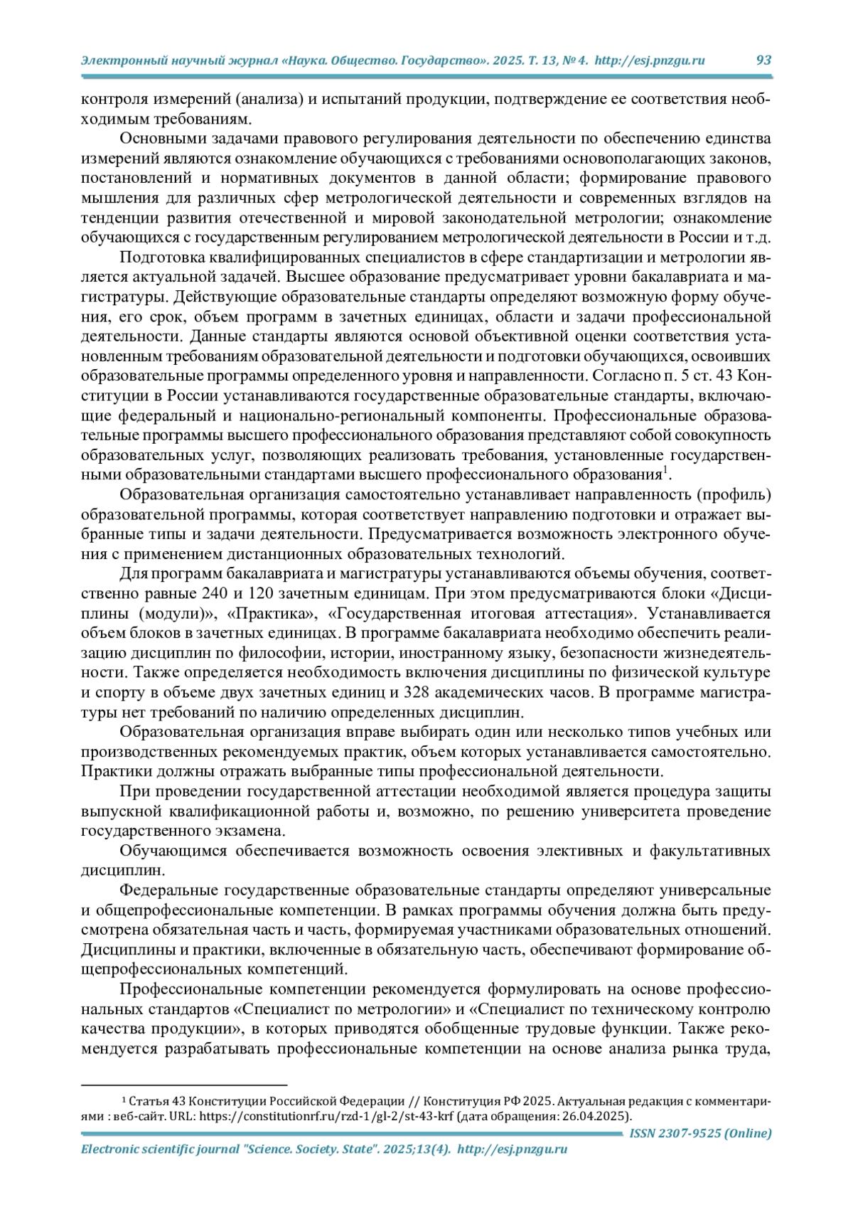 Материалы и методы. Реализация исследовательских задач была достигнута на основе анализа основных образовательных программ и профессиональных стандартов «Специалист по метрологии» и «Специалист по техническому контролю качества продукции», нормативно-правовой базы, составляющей основу компетентности специалиста в данной сфере.