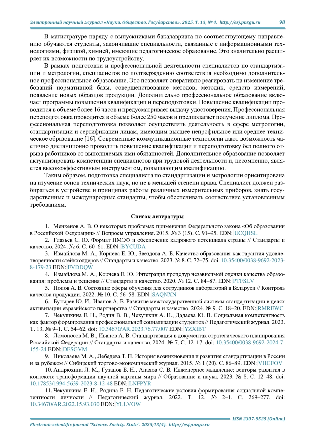 7. Чекушкина Е. Н., Родин В. В., Чекушкин А. Н., Дадаева Ю. В. Социальная компетентность как фактор формирования профессиональной социализации студентов // Педагогический журнал. 2023. Т. 13, № 9-1. С. 54-62. DOI: 10.34670/AR.2023.76.77.007 EDN: YZXIBT