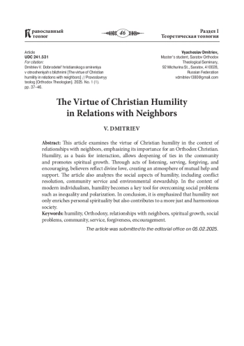 В данной статье рассматривается добродетель христианского смирения в контексте отношений с ближними, подчеркивается ее важность для православного христианина. Смирение как основа взаимодействия позволяет углубить связи в общине и способствует духовному росту. Через акты слушания, служения, прощения и ободрения верующие отражают Божественную любовь, создавая атмосферу взаимопомощи и поддержки. Статья также анализирует социальные аспекты смирения, включая разрешение конфликтов, общественную работу и бережное отношение к окружающей среде. В условиях современного индивидуализма смирение становится ключевым инструментом для преодоления социальных проблем, таких как неравенство и поляризация общества. В заключение подчеркивается, что смирение не только обогащает личную духовность, но и способствует созданию более справедливого и гармоничного общества.