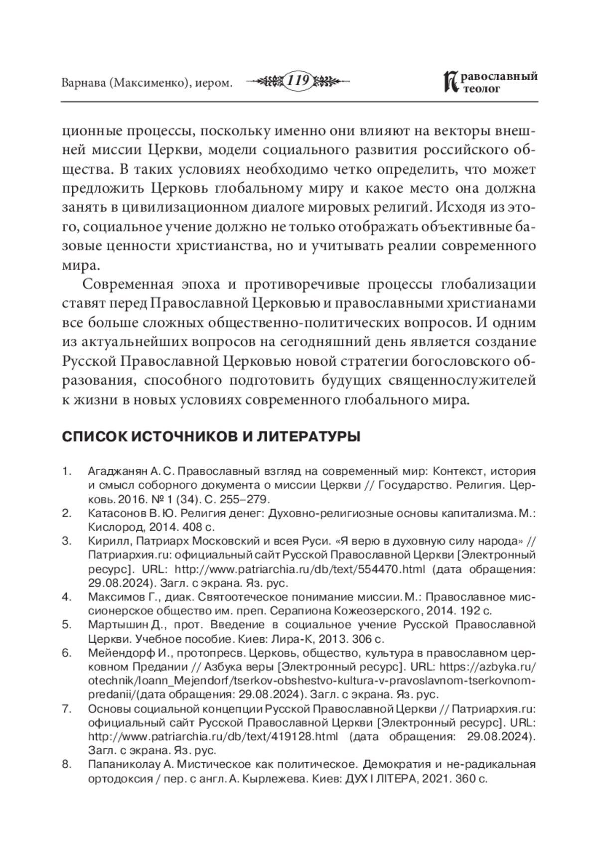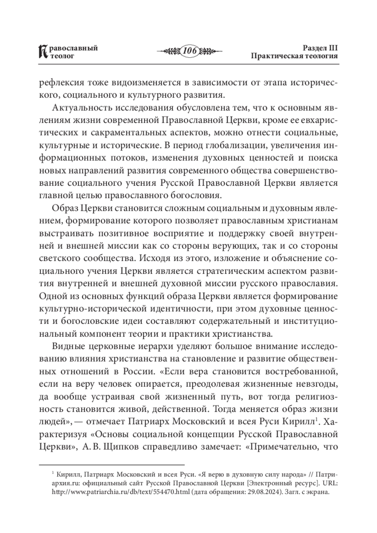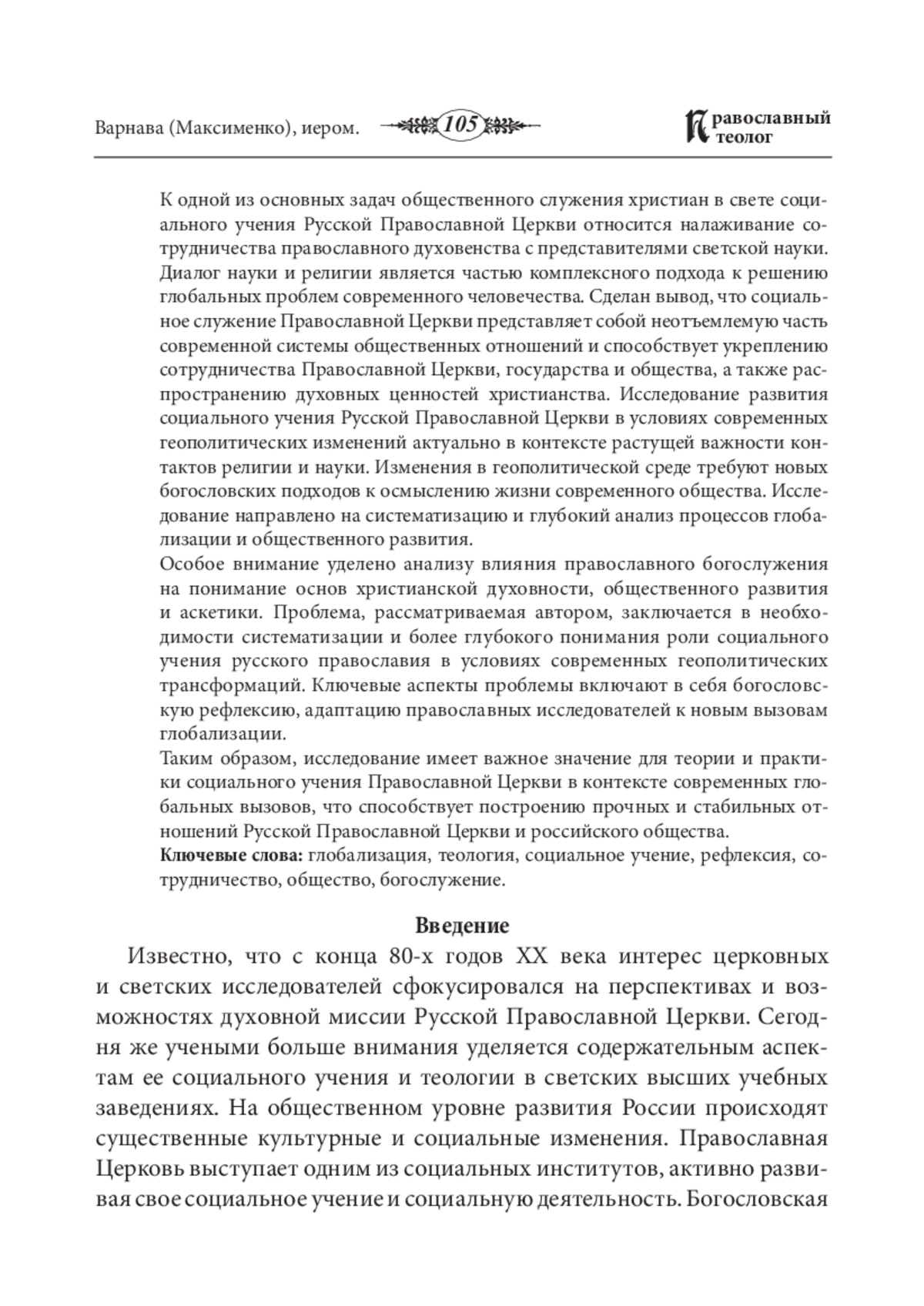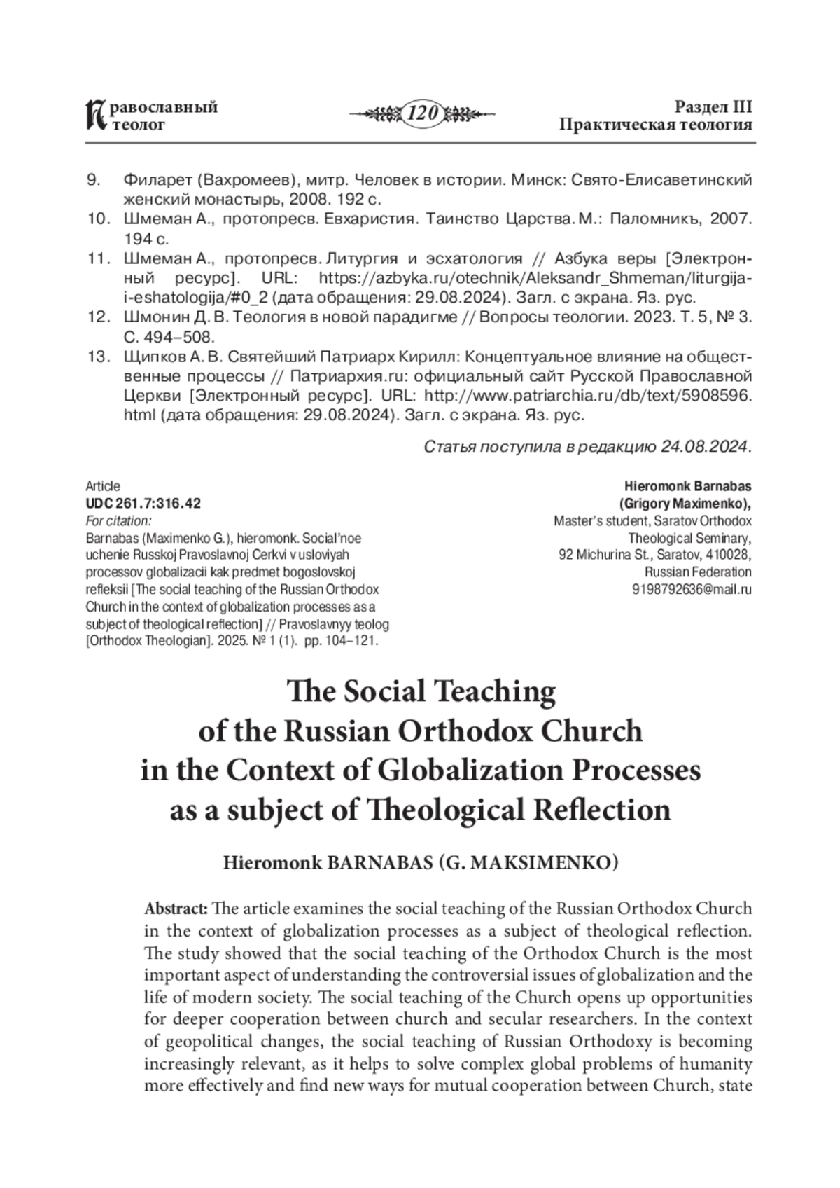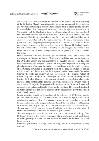 В статье рассмотрено социальное учение Русской Православной Церкви в условиях процессов глобализации как предмет богословской рефлексии. Исследование показало, что социальное учение Православной Церкви является важнейшим аспектом осмысления противоречивых вопросов глобализации и жизни современного общества в целом. Социальное учение Церкви открывает возможности для более глубокого сотрудничества церковных и светских исследователей. В контексте геополитических изменений социальное учение русского православия становится все более актуальным, так как оно помогает более эффективно решать сложные глобальные проблемы человечества и находить новые пути для сотрудничества Церкви, государства и общества. Отмечено, что научные исследования в сфере социального учения Православной Церкви позволяют лучше понять сложность и многогранность богословской рефлексии как специфической формы теологической рациональности. Установлено, что богословская рефлексия охватывает духовные явления христианства и богословские теории познания Бога, мира и человека. Рефлексия связана с умением христианского исследователя изучать богословие христианства в актуальности контекста и индивидуальной мысли каждого человека, а также с богословским анализом социальных явлений глобального мира и прошлого духовного опыта христианства. В целях лучшего понимания сущности социального учения Русской Православной Церкви автор рассматривает эсхатологический и литургический опыт как ключевые элементы духовной жизни православного христианина. К одной из основных задач общественного служения христиан в свете социального учения Русской Православной Церкви относится налаживание сотрудничества православного духовенства с представителями светской науки. Диалог науки и религии является частью комплексного подхода к решению глобальных проблем современного человечества. Сделан вывод, что социальное служение Православной Церкви представляет собой неотъемлемую часть современной системы общественных отношений и способствует укреплению сотрудничества Православной Церкви, государства и общества, а также распространению духовных ценностей христианства. Исследование развития социального учения Русской Православной Церкви в условиях современных геополитических изменений актуально в контексте растущей важности контактов религии и науки. Изменения в геополитической среде требуют новых богословских подходов к осмыслению жизни современного общества. Исследование направлено на систематизацию и глубокий анализ процессов глобализации и общественного развития. Особое внимание уделено анализу влияния православного богослужения на понимание основ христианской духовности, общественного развития и аскетики. Проблема, рассматриваемая автором, заключается в необходимости систематизации и более глубокого понимания роли социального учения русского православия в условиях современных геополитических трансформаций. Ключевые аспекты проблемы включают в себя богословскую рефлексию, адаптацию православных исследователей к новым вызовам глобализации. Таким образом, исследование имеет важное значение для теории и практики социального учения Православной Церкви в контексте современных глобальных вызовов, что способствует построению 