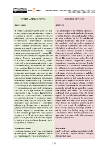 В статье раскрывается символическое значение лексем и фразеологизмов, зафиксированных в дискурсе диалектоносителей обрядовой традиции брянско-гомельскочерниговского приграничья. Изучается лексика и фразеология календарных праздников, обрядов жизненного цикла, народных верований, народной медицины и магии. Материал исследования — беседы с носителями традиционной культуры Новозыбковского городского округа Брянской области. Методы изыскания: дискурсивный анализ, компонентный метод, семантический и контекстуальный анализ, описательный метод. Установлено, что семантика лексико-фразеологических единиц, принадлежащих к числу обозначений календарных праздников, определяется широким спектром символических значений: запретом на шитье, достатком, ритуальным очищением, инициацией и др. Лексемы и фразеологизмы обрядов жизненного цикла также содержат достаточно широкую палитру символических значений: инициации, достатка, отказа при сватовстве, разлуки, одаривания и др. Лексико-фразеологический пласт, соотносительный с народными верованиями, фиксирует символику кругового движения, жертвы умершему, трансформации душ усопших в зооморфные образы и др. В нарративах о народной медицине и магии лексико-фразеологические единицы выражают символическое значение вражды, разрушения, исцеляющей энергии и др. В рассмотренных обрядах ритуальные действия выполняют продуцирующую и апотропейную функции, носят вредоносный характер.