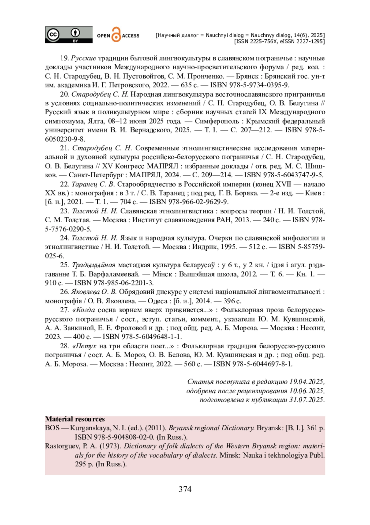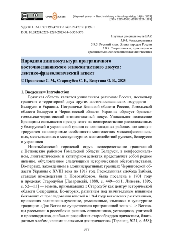 20. Стародубец С. Н. Народная лингвокультура восточнославянского приграничья в условиях социально-политических изменений / С. Н. Стародубец, О. В. Белугина // Русский язык в поликультурном мире : сборник научных статей IX Международного симпозиума, Ялта, 08-12 июня 2025 года. - Симферополь : Крымский федеральный университет имени В. И. Вернадского, 2025. - Т. I. - С. 207-212. - ISBN 978-5- 6050230-9-8.