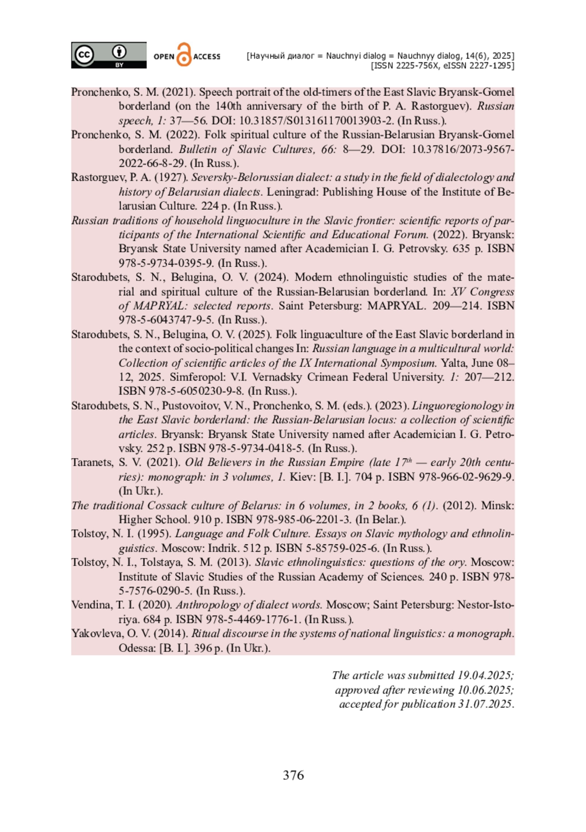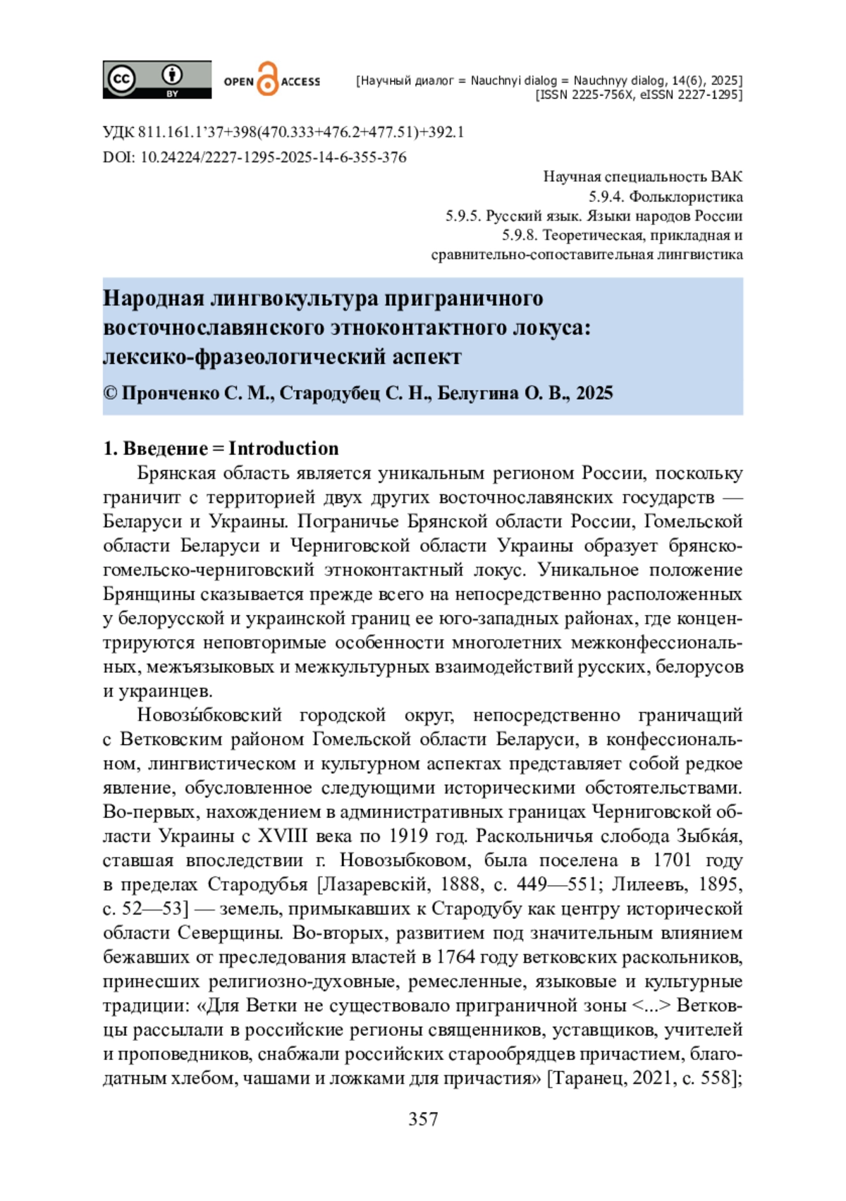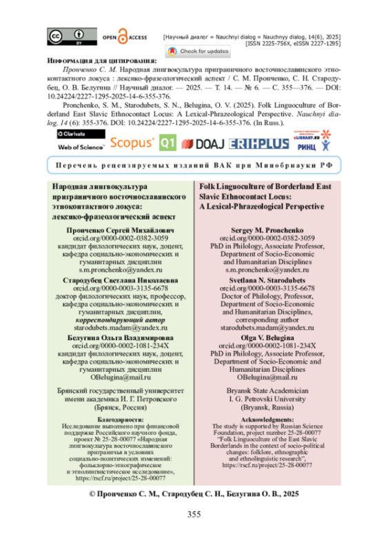 19. Русские традиции бытовой лингвокультуры в славянском пограничье : научные доклады участников Международного научно-просветительского форума / ред. кол. : С. Н. Стародубец, В. Н. Пустовойтов, С. М. Пронченко. - Брянск : Брянский гос. ун-т им. академика И. Г. Петровского, 2022. - 635 с. - ISBN 978-5-9734-0395-9.