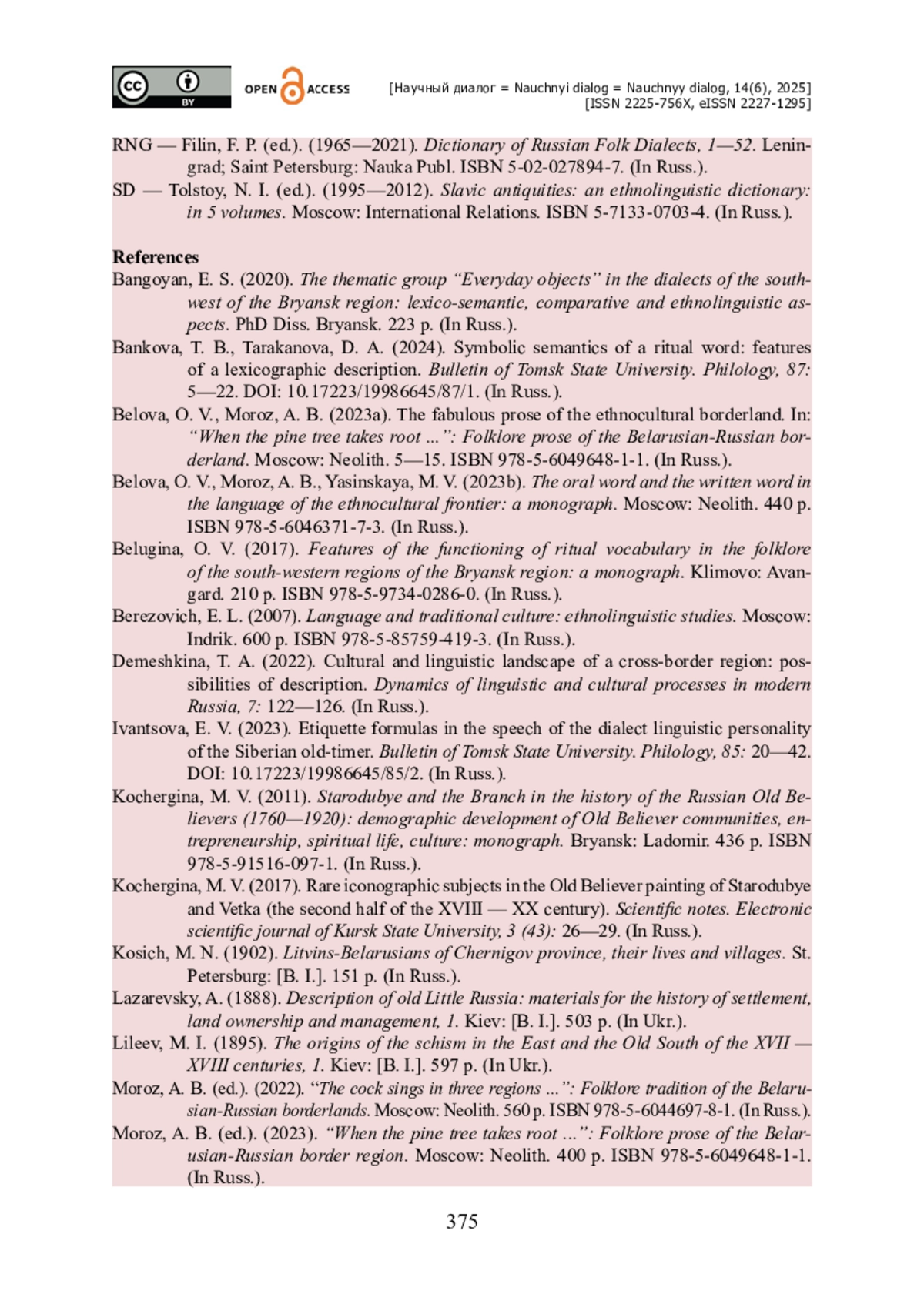2. Банкова Т. Б. Символическая семантика обрядового слова : особенности лексикографического описания / Т. Б. Банкова, Д. А. Тараканова // Вестник Томского государственного университета. Филология. - 2024. - № 87. - С. 5-22. - https://doi.org/10.17223/19986645/87/1.