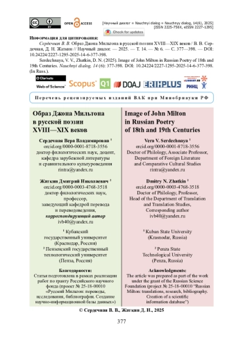 Исследование посвящено анализу становления и осмыслению динамики развития содержания образа английского поэта Джона Мильтона в русской лирической и лироэпической поэзии. Материалом для изучения стали лирические и лироэпические произведения русских писателей XVIII — XIX веков, содержащие упоминания о Мильтоне. При подготовке статьи использовались герменевтический, историкокультурный и сопоставительный методы исследования. Выявлены три направления в трактовке образа Мильтона в русской поэзии XVIII — XIX веков. Первое из них, представленное в рамках классицизма, связано с введением имени Мильтона в канон классической литературы и использованием его образа как аргумента к формированию индивидуального, неповторимого облика российской поэзии. Второе направление (в рамках сентиментализма и романтизма) ведет к созданию образа одинокого, трагически непонятого современниками гения, слепца-провидца; кроме того, авторы эпохи сентиментализма ценят контрасты поэтики Мильтона-стилиста, а поэты романтической традиции видят в нем характерного героя эпохи. Третье направление (с начала XIX века, преимущественно в рамках романтизма и реализма) связано с ироническим, снижающим и отстраняющим осмыслением поэтики Мильтона.