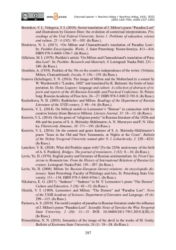 3. Бортников В. И. Советский перевод поэмы Дж. Мильтона «Потерянный рай» и иллюстрации к ней Гюстава Доре : эволюция контекстных интерпретаций / В. И. Бортников, Т. И. Волегова // Известия Уральского федерального университета. Сер. 1. Проблемы образования, науки и культуры. - 2019. - Т. 25. - № 4 (192). - С. 95-105.