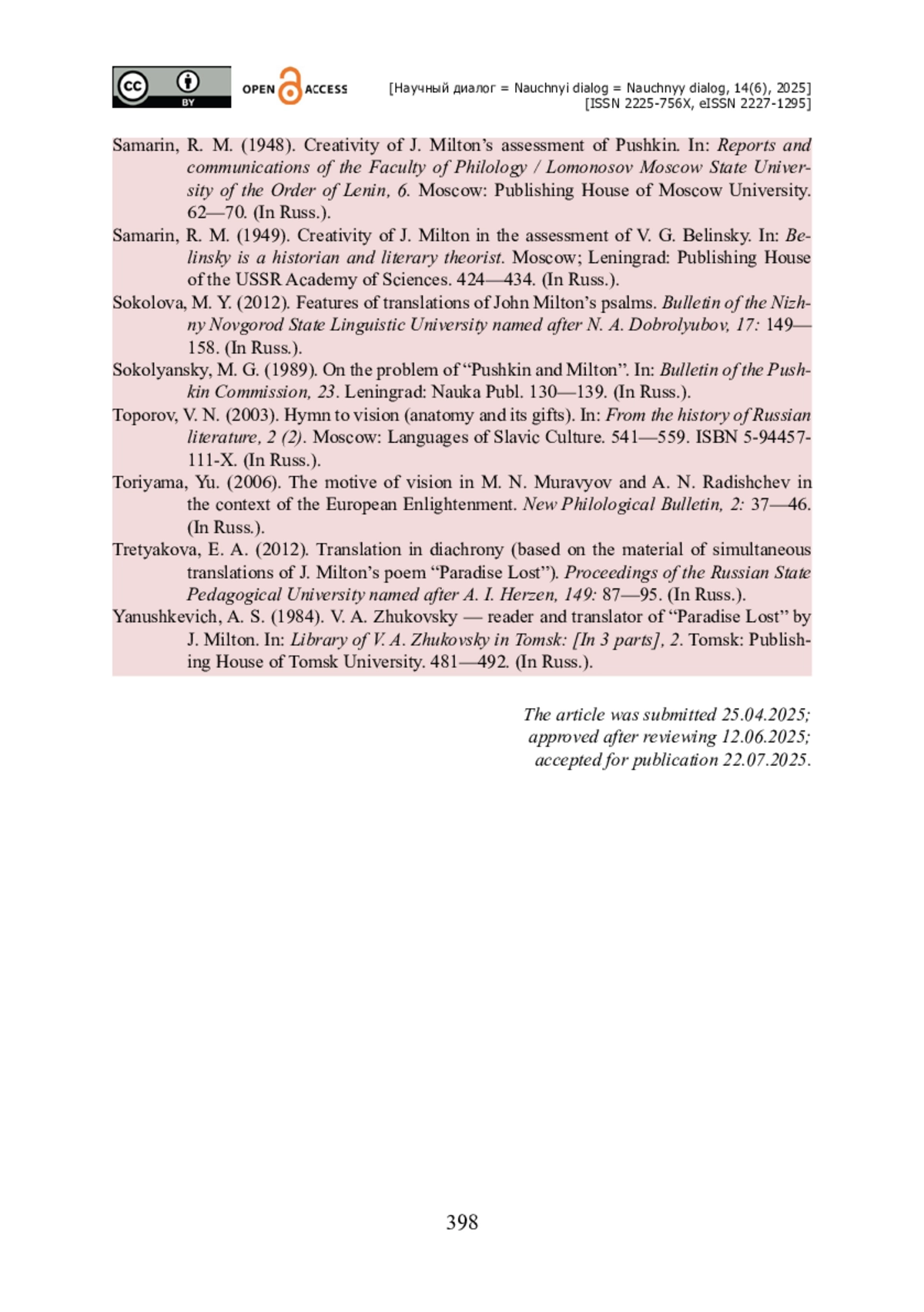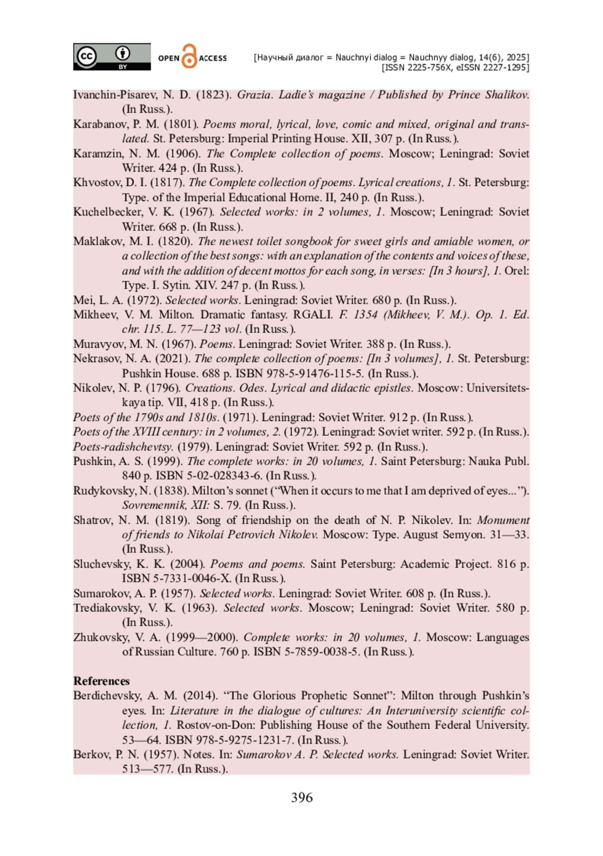 1. Бердичевский А. М. «Славный пророческий сонет»: Мильтон глазами Пушкина / А. М. Бердичевский // Литература в диалоге культур : Межвузовский научный сборник. - Ростов-на-Дону : Изд-во Южного федерального университета, 2014. - Выпуск 1. - С. 53-64. - ISBN 978-5-9275-1231-7.