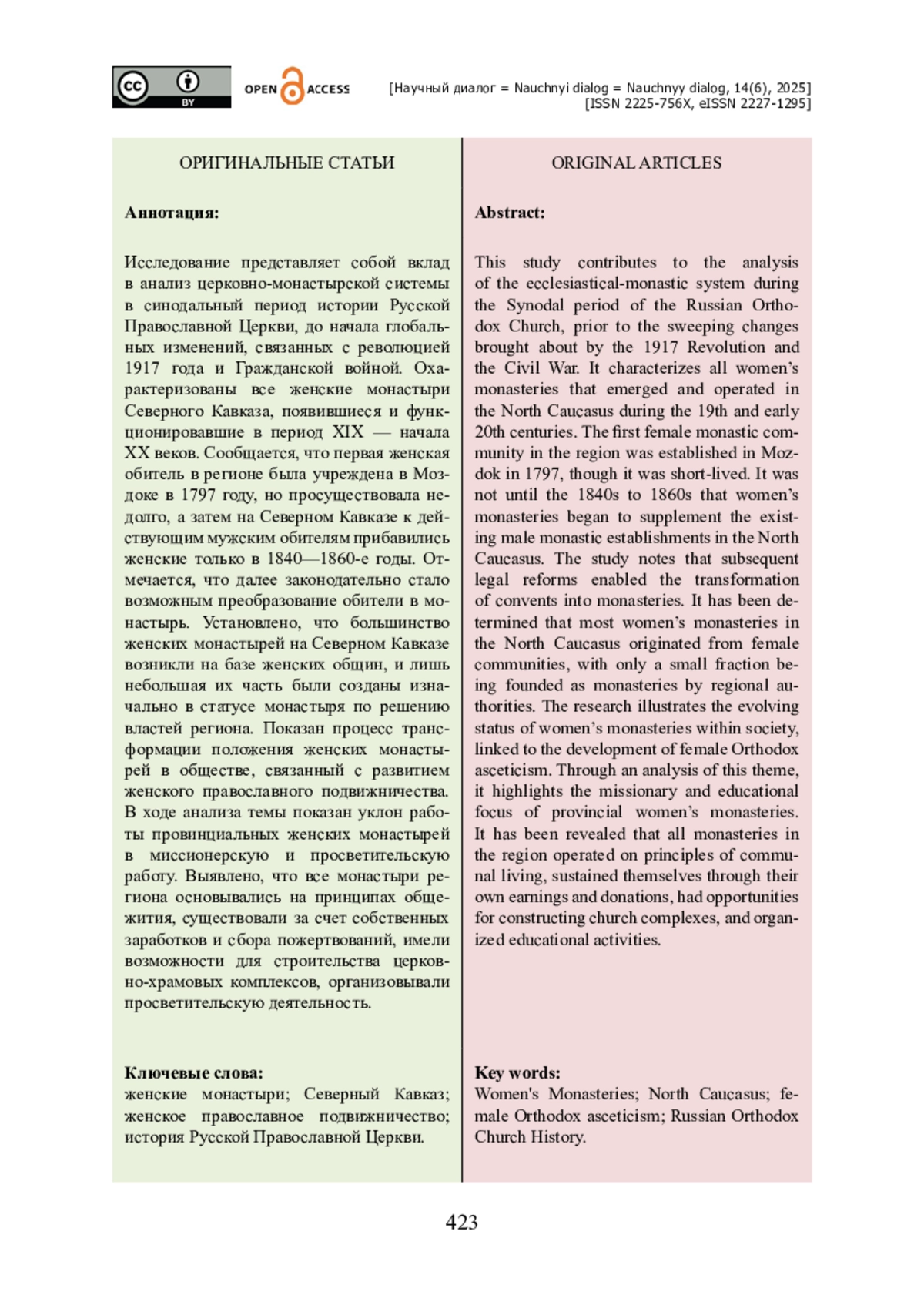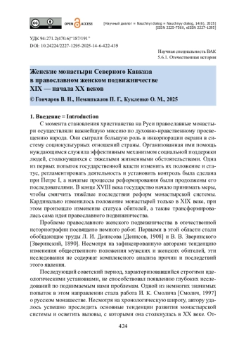 Исследование представляет собой вклад в анализ церковно-монастырской системы в синодальный период истории Русской Православной Церкви, до начала глобальных изменений, связанных с революцией 1917 года и Гражданской войной. Охарактеризованы все женские монастыри Северного Кавказа, появившиеся и функционировавшие в период XIX — начала XX веков. Сообщается, что первая женская обитель в регионе была учреждена в Моздоке в 1797 году, но просуществовала недолго, а затем на Северном Кавказе к действующим мужским обителям прибавились женские только в 1840—1860-е годы. Отмечается, что далее законодательно стало возможным преобразование обители в монастырь. Установлено, что большинство женских монастырей на Северном Кавказе возникли на базе женских общин, и лишь небольшая их часть были созданы изначально в статусе монастыря по решению властей региона. Показан процесс трансформации положения женских монастырей в обществе, связанный с развитием женского православного подвижничества. В ходе анализа темы показан уклон работы провинциальных женских монастырей в миссионерскую и просветительскую работу. Выявлено, что все монастыри региона основывались на принципах общежития, существовали за счет собственных заработков и сбора пожертвований, имели возможности для строительства церковно-храмовых комплексов, организовывали просветительскую деятельность.