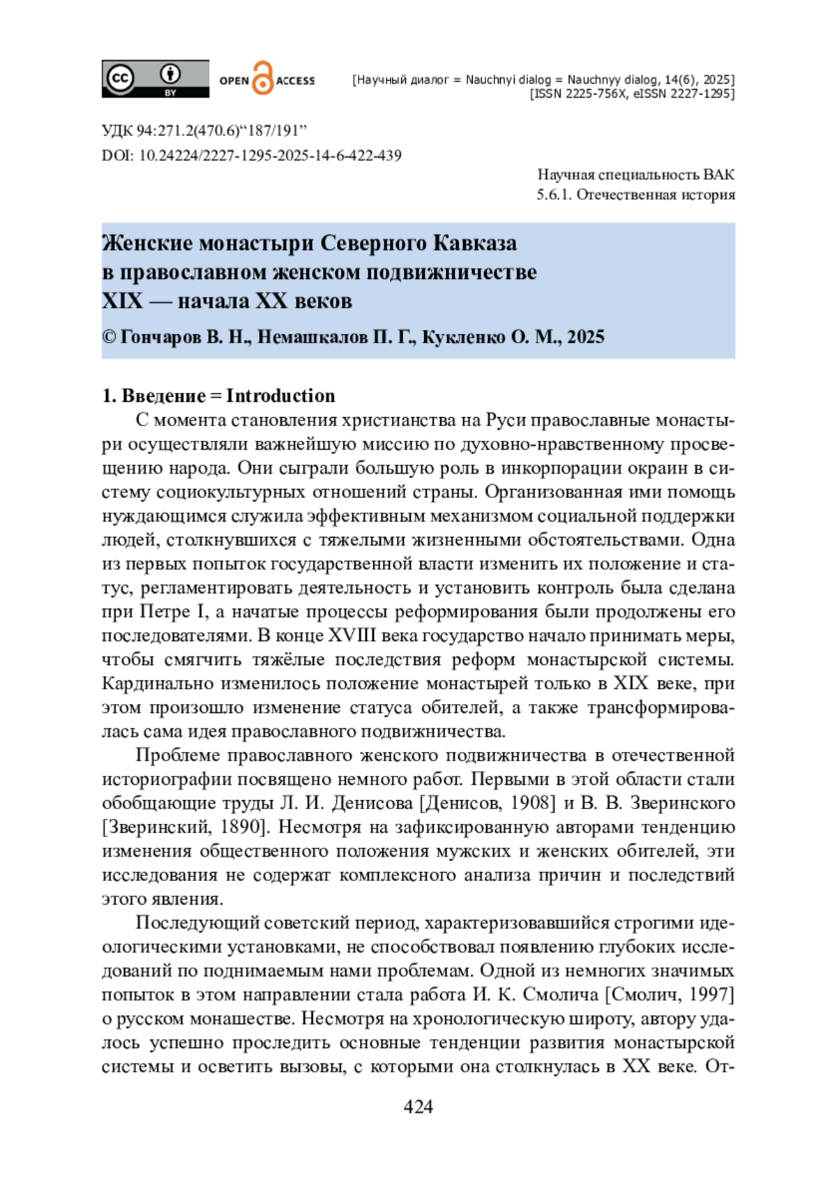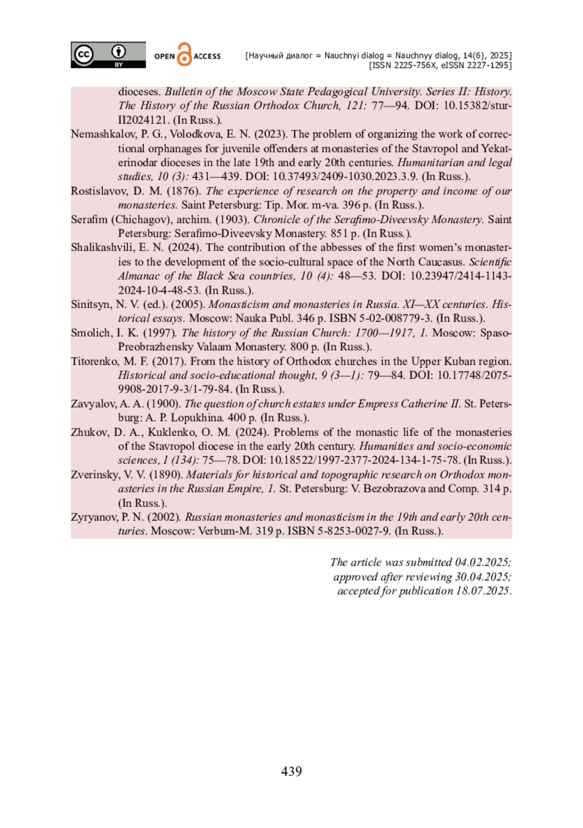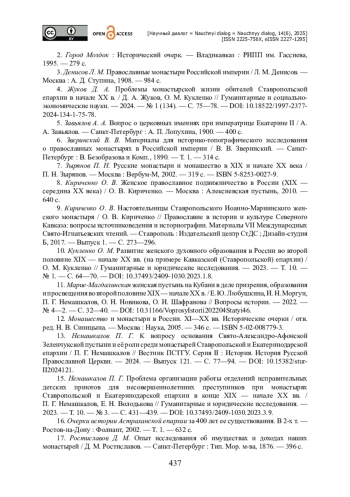 4. Жуков Д. А. Проблемы монастырской жизни обителей Ставропольской епархии в начале XX в. / Д. А. Жуков, О. М. Кукленко // Гуманитарные и социальноэкономические науки. - 2024. - № 1 (134). - С. 75-78. - https://doi.org/10.18522/1997-2377-2024-134-1-75-78.