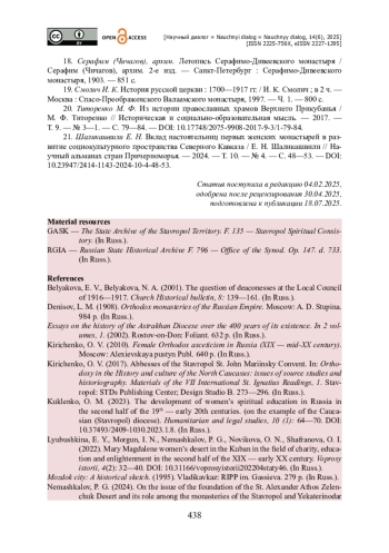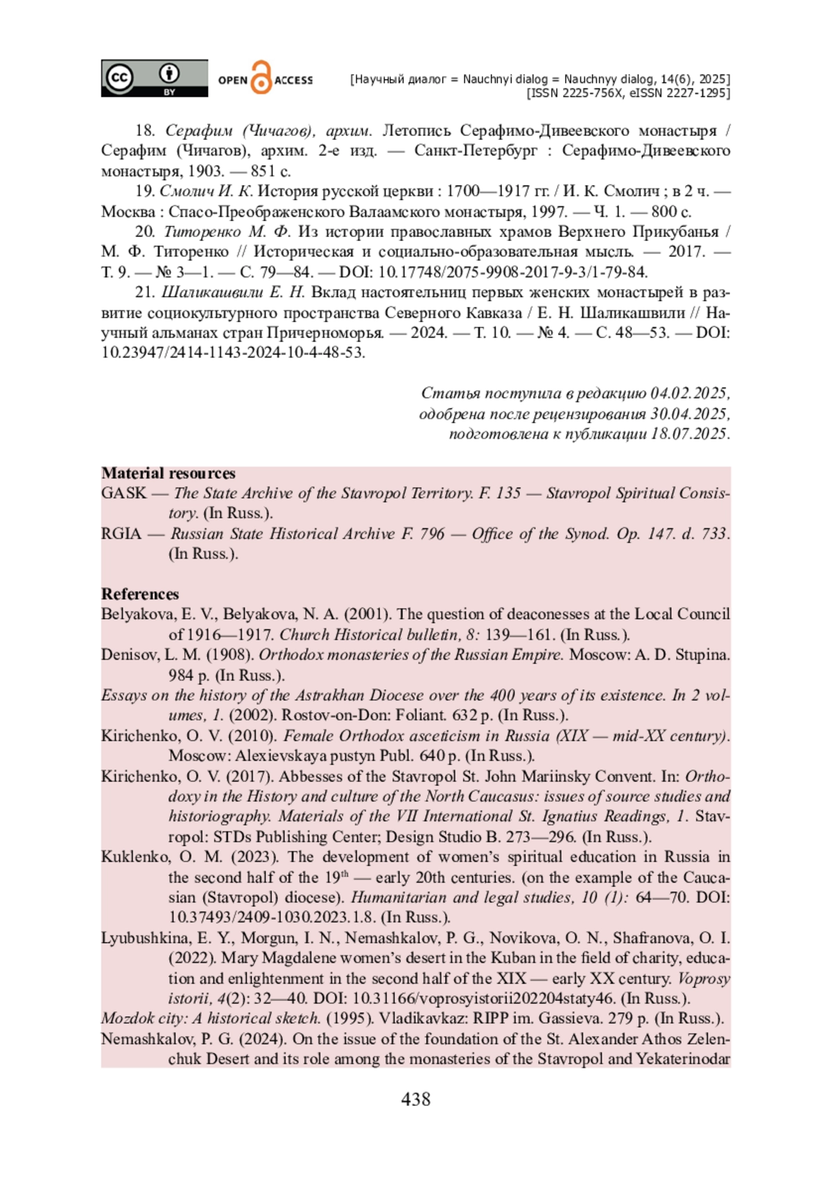 20. Шаликашвили Е. Н. Вклад настоятельниц первых женских монастырей в развитие социокультурного пространства Северного Кавказа / Е. Н. Шаликашвили // Научный альманах стран Причерноморья. - 2024. - Т. 10. - № 4. - С. 48-53. - https://doi.org/10.23947/2414-1143-2024-10-4-48-53.